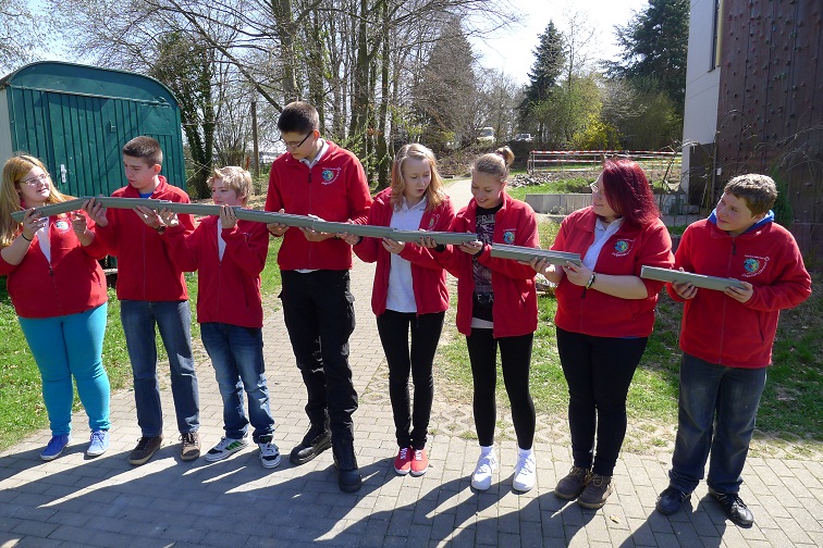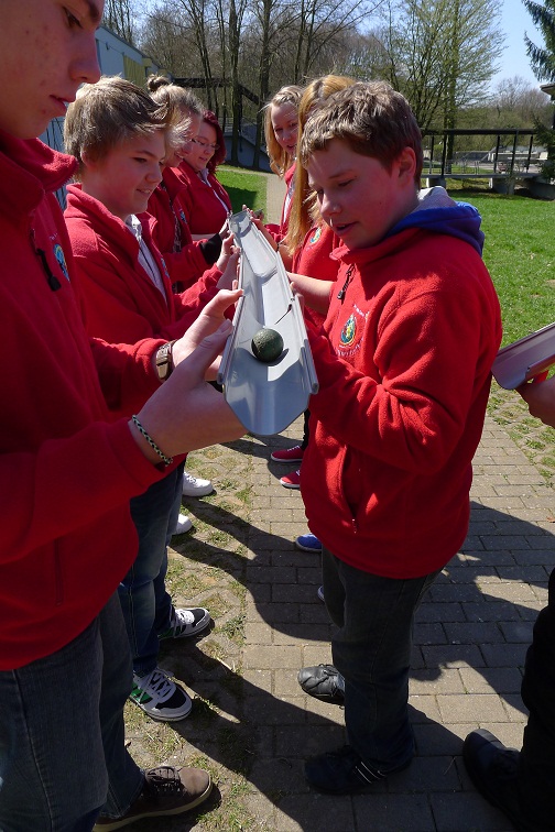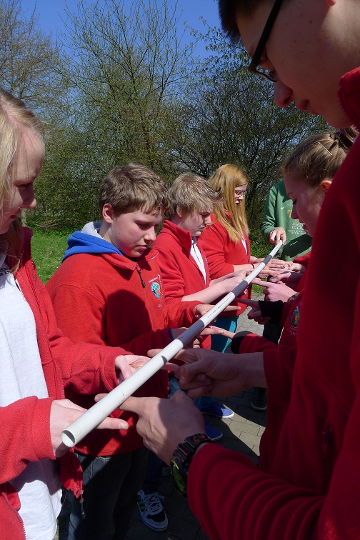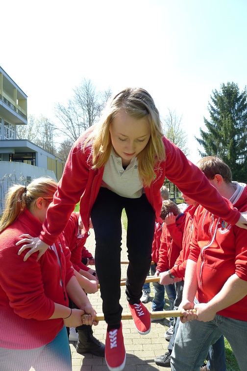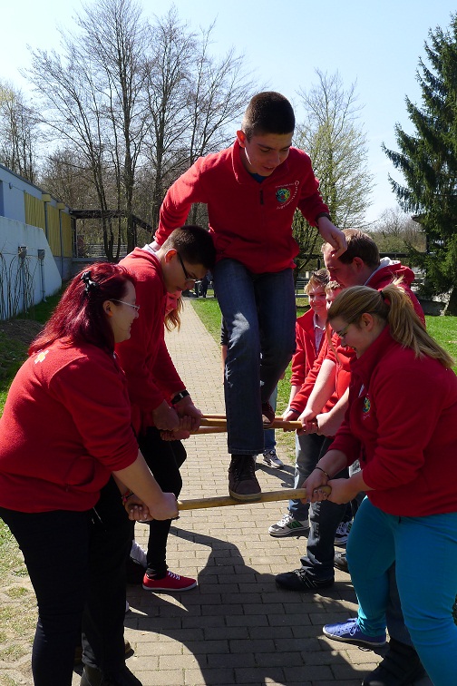 Um 12 Uhr ging es für die Jugendrotkreuzler aus Weilerswist los nach Walberberg, wo 2 Trainer der Jugendakademie Walberberg auf uns warteten. Schon die erste Aufgabe war nicht alleine zu bewältigen, denn mit Dachrinnenstücken musste ein Ball zum Ziel befördert werden. Als nächstes kam die scheinbar einfache Aufgabe einen Stab, der nur mit den Fingerspitzen berührt werden durfte, auf den Boden zu legen. Durch gemeinsames Überlegen kamen wir nach einigen Versuchen auf die Lösung und meisterten auch diese Station. Viel Vertrauen forderte die Teambrücke, wo ein Einzelner von den anderen Gruppenmitgliedern getragen werden musste. Trotz großer Überwindung hat sich Jeder dieser Aufgabe gestellt. Eine große Wippe stellte uns vor das Problem, die Gruppe mit kleinen und präzisen Schritten ins Gleichgewicht zu bringen. Nach einer kleinen Stärkung für uns und die Trainer, ging es endlich an die Kletterwand. Hier wurde das Vertrauen weiter gestärkt, da wir uns gegenseitig sichern mussten. Nachdem die Kletterwand von allen eifrig genutzt und teilweise auch bis oben erklommen wurde, endete bei einem leckeren Eis ein sehr schöner Nachmittag.