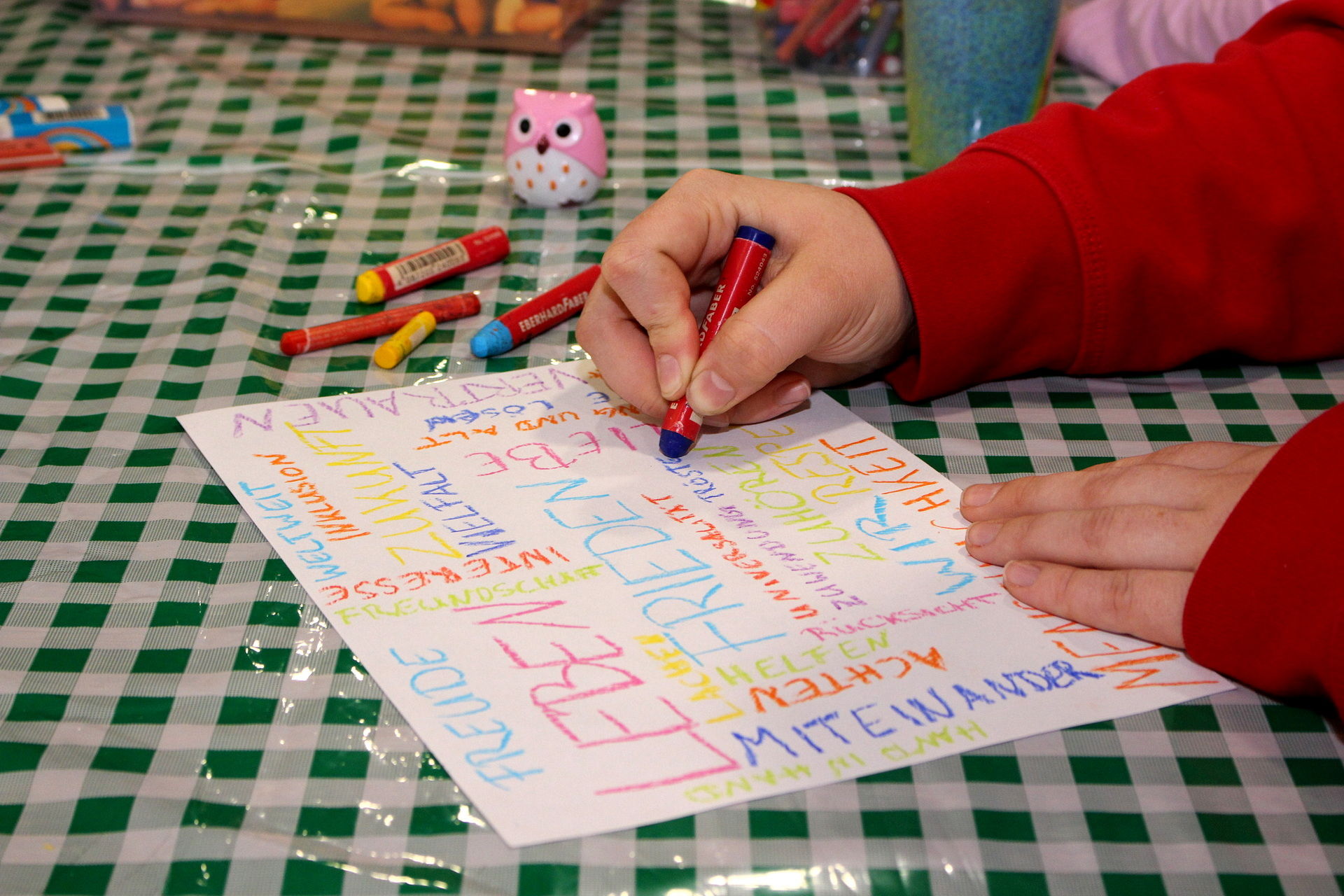 Das Jugendrotkreuz organisierte ein Malangebot für die jungen Besucher unter dem Motto „Frieden“, für das Projekt „Erste Hilfe fürs Klima“ sammelte man friedvolle Botschaften für den „Tunnel of Visions“ auf dem Gelände der „Rotkreuz-Akademie Vogelsang“.