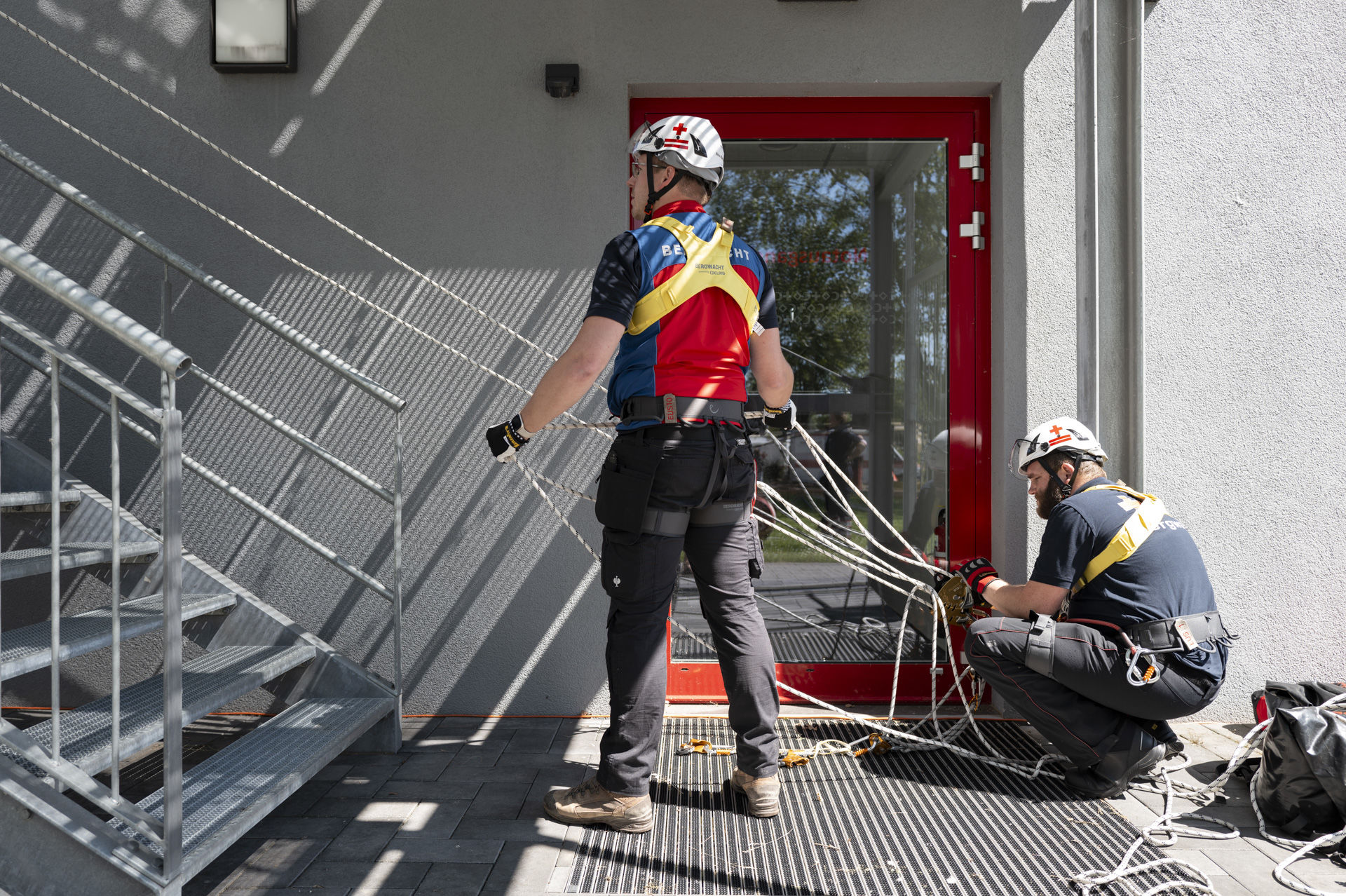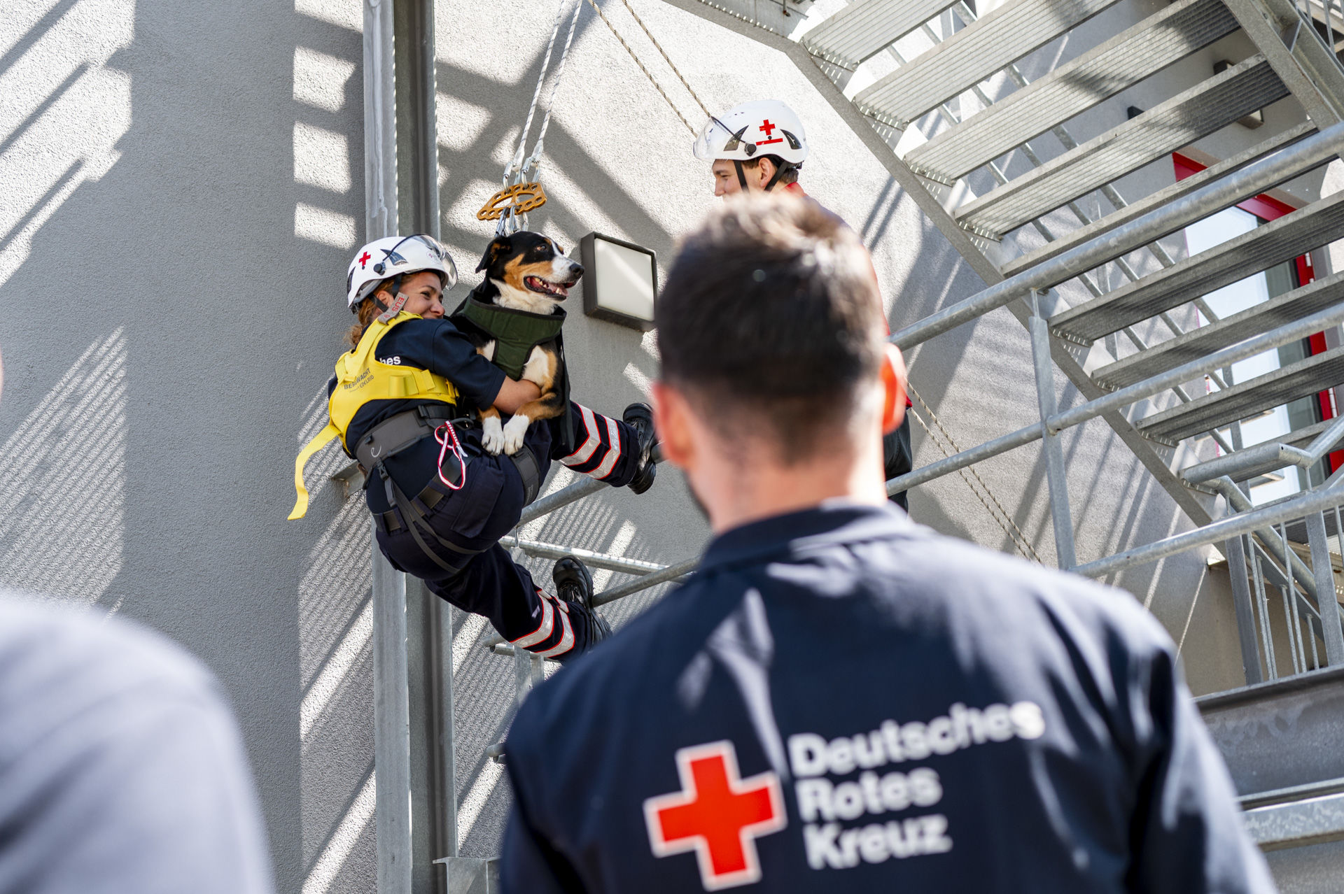 Dass zwischen den Tieren und ihren Besitzern ein besonderes Vertrauensverhältnis besteht, wurde eine Station weiter eindrücklich unter Beweis gestellt. In Zusammenarbeit mit der Bergwacht übten die Hundeführer das Klettern und Abseilen mit Hund. An der stählernen Fluchttreppe hatten Jonathan Klinkhammer, Nico Hamann und Daniel Hermanns von der Bergwacht ihre Ausrüstung fixiert. Während es für die Hundeführerinnen Nadine Lepsien und Karina Boszke wenige Meter im Seil hoch- und wieder runterging, ließen sich der Appenzeller Sennenhund Roxy und der junge Boxer-Rüde Winnie Puuh in den Tragegeschirren nicht aus der Ruhe bringen.