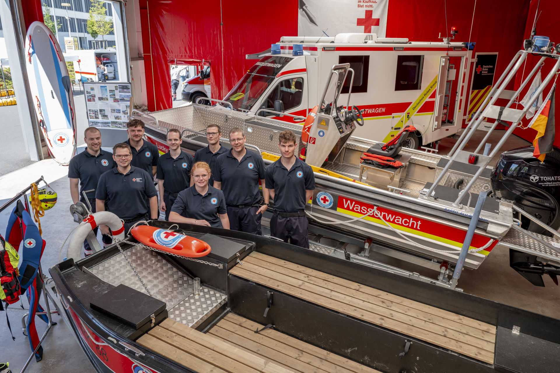 Neben den Wasserrettern präsentierten Alexander Heine und Timo Prinz den modernen Einsatzleitwagen des DRK. „Während eines Einsatzes können wir aus dem Auto heraus unsere Kräfte koordinieren“, erläuterte Timo Prinz von der Kreisbereitschaftsleitung. Auch der Austausch mit Einsatzkräften anderer Partner erfolge darüber.