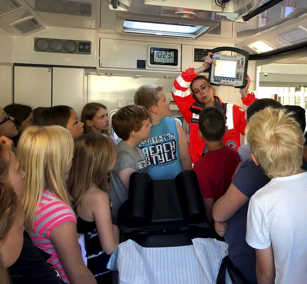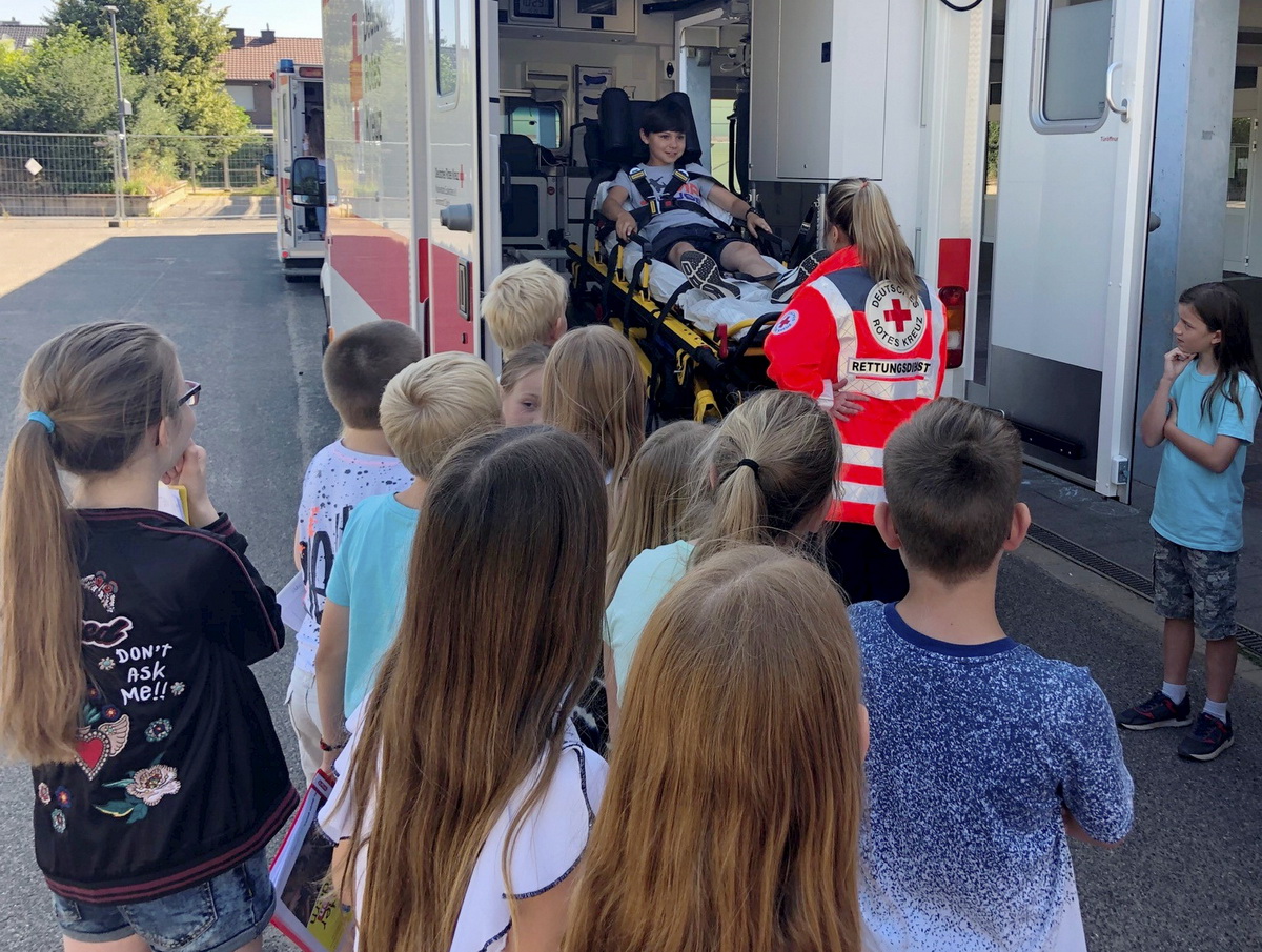 Höhepunkt ist für viele Kinder immer der Abschlusstag, wenn das Rote Kreuz mit einem oder mehreren Rettungswagen vorfährt und die Kinder die Einsatzfahrzeuge inspizieren dürfen. Möglich gemacht wurde das Projekt wie jedes Jahr durch eine Spende der Kreissparkasse Euskirchen.