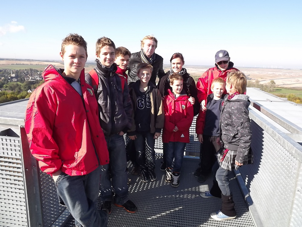 Nach einem spannenden Rundgang durch den Ort, ging es weiter zum Tagebau Inden, dessen Ausläufer nur noch ca. einen Kilometer von Pier weg sind. Von der Aussichtsplattform wurden die Absetzer, die Schaufelbagger, die langen Förderbänder und die LKW-Kipper bestaunt. Die Miniaturform des Indemanns vermittelte einen Vorgeschmack auf den „Großen“. Nach einer kurzen Fahrt mit den MTW’s erreichten wir frohgelaunt und voller Vorfreude den Indemann. Sofort wurde er von allen neugierig bestiegen und vom Ausleger die Aussicht über den Tagebau und die angrenzenden Orte genossen. Wer jetzt noch Lust hatte, konnte den Aufstieg zur zweiten Plattform wagen.
