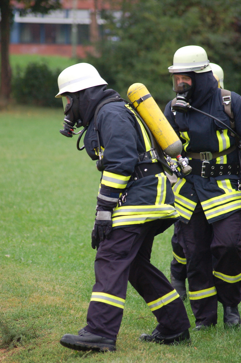 In kleinen Gruppen mit jeweils acht bis neun Einsatzkräften werden die Feuerwehrleute langsam an die ungewohnte Arbeitsweise mit den umluftunabhängigen Atemschutzgeräten herangeführt - eine ziemlich anstrengende und schweißtreibende Arbeit.