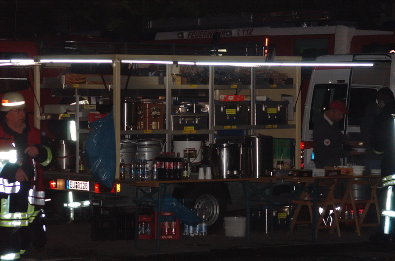 Ebenfalls im Einsatz waren die Wechselladerfahrzeuge mit den Abrollbehältern Alarm, Atemschutzwerkstatt und Sonderlöschmittel des Kreisbrandschutzzentrums Schleiden. Das Rote Kreuz der Römerstadt war ebenfalls vor Ort und versorgte die eingesetzten Kräfte mit kalten und heißen Getränken und einem Imbiss.