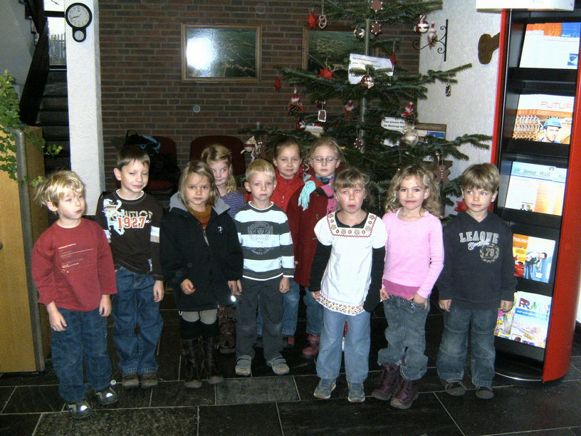 Blankenheim - Wir, die Vorschulkinder des DRK-Kindergartens "Kastanienlaube" in Ripsdorf, wurden am Montag, den 30.11.09, in Fahrgemeinschaften um 8.30 Uhr zur VR Bankfiliale in Lommersdorf gebracht. Dort angekommen schmückten wir mit Frau Peetz und Frau Kremer den schon aufgestellten Weihnachtsbaum mit selbstgebasteltem Weihnachtsschmuck. Nachdem wir die selbstgemachten Lebkuchenbrezeln und -herzen, sowie Sterne, Wichtelmännchen und Kugeln aufgehängt hatten, bekamen wir von Herrn Krämer alle etwas Süßes zur Stärkung. Anschließend machten wir noch einige Erinnerungsfotos und begaben uns auf… Weiterlesen