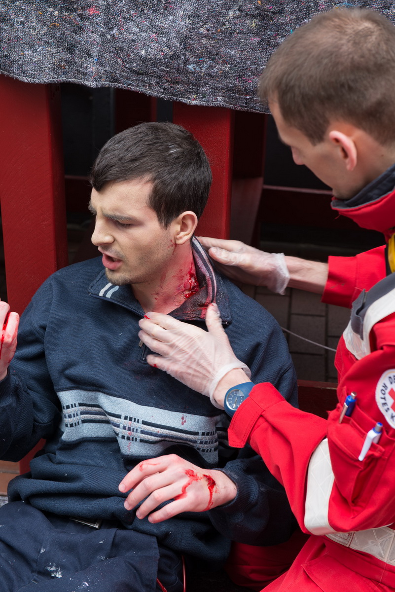 Das Team der Realistischen Notfalldarstellung hatte ganze Arbeit geleistet: So musste beispielsweise ein Betroffener mit einer Amputationsverletzung ebenso versorgt werden wie ein verunglückter Motorradfahrer oder eine Passantin, die im städtischen Kino Opfer einer Messerattacke geworden war.