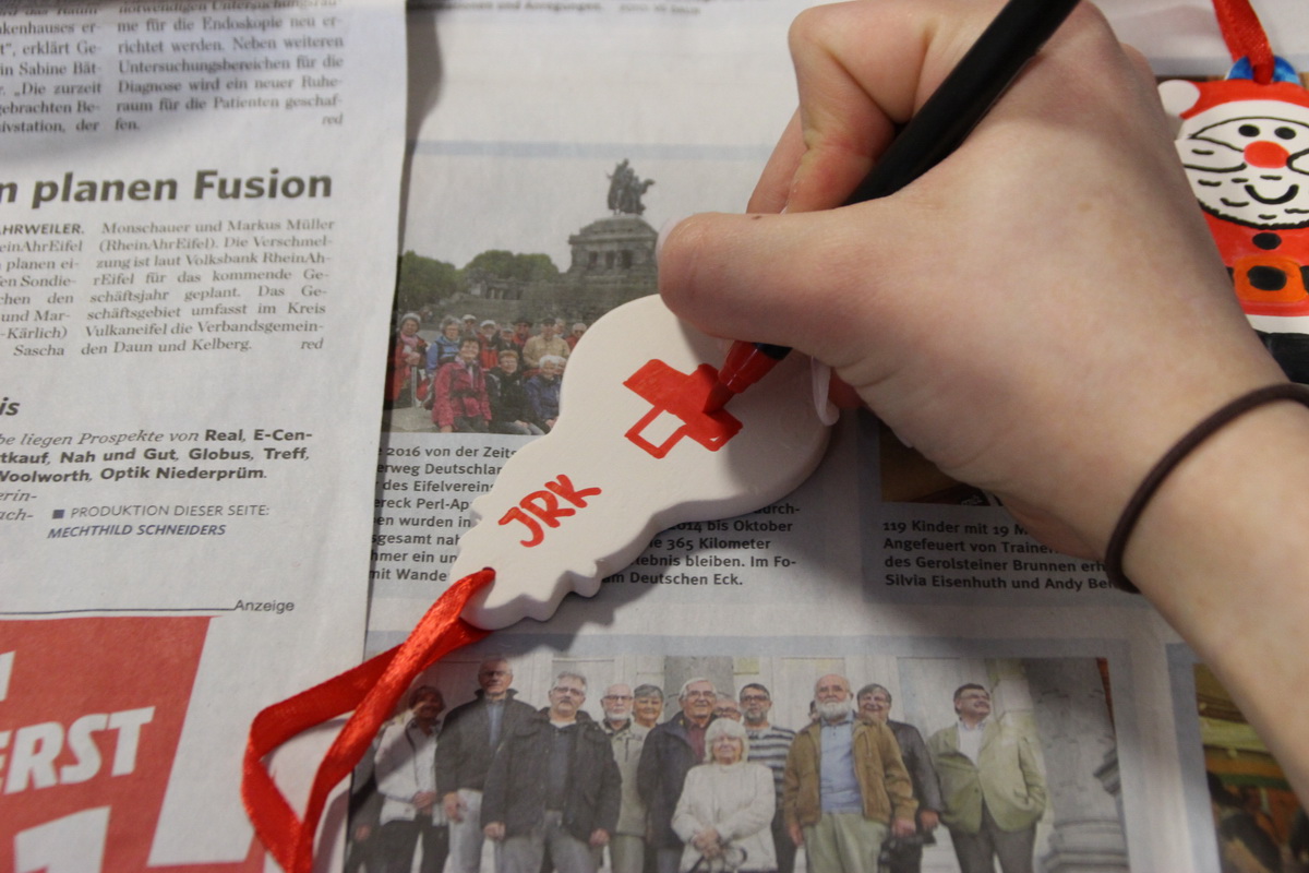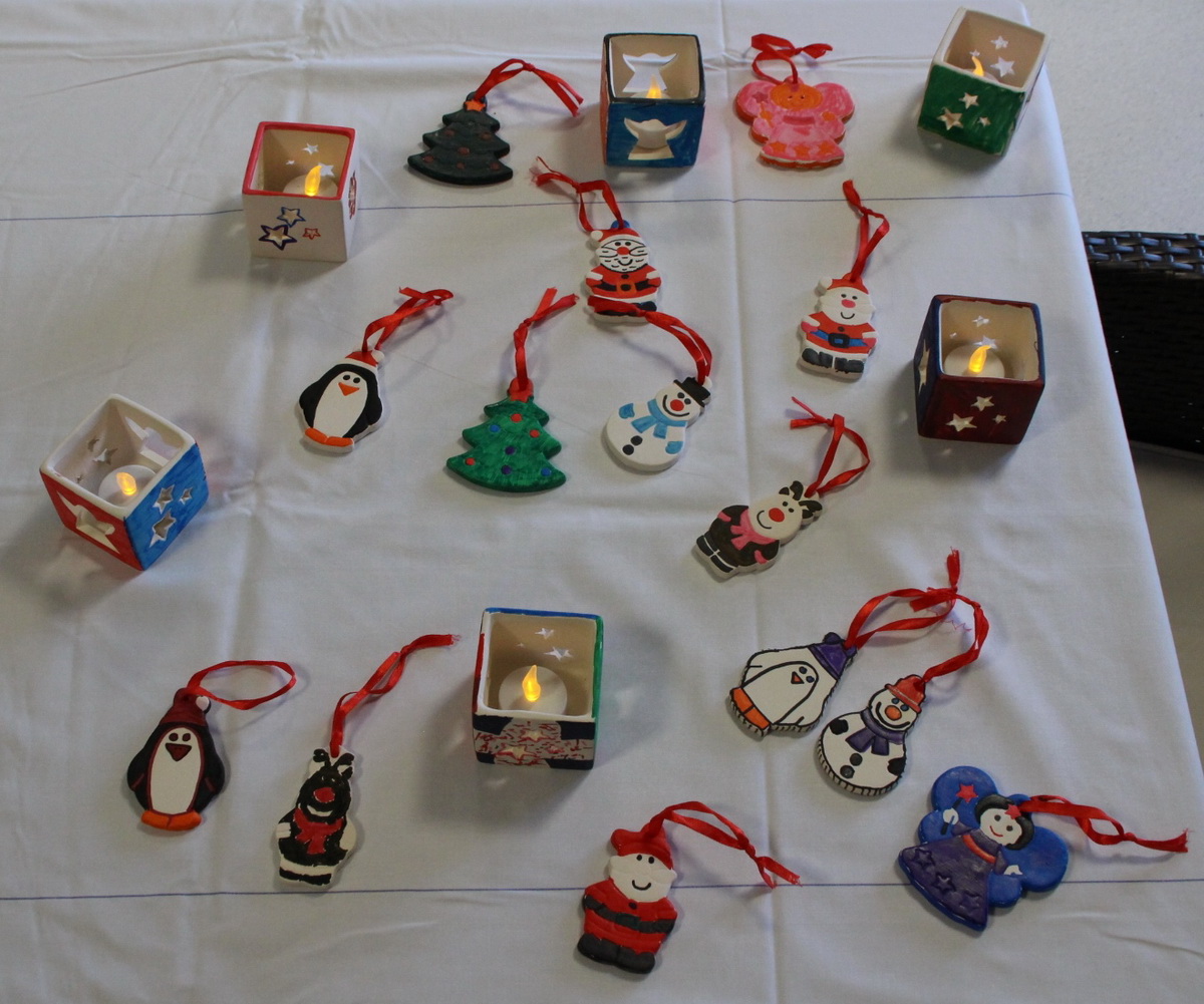 Des Weiteren konnten 3 D-Holzbäumchen, Windlichter und Weihnachtsbaumschmuck bemalt und gestaltet werden. Jeder Teilnehmer durfte einen Gegenstand mit nach Hause nehmen. Einige, die sich selbst kein Windlicht, keine Weihnachtskarte, Weihnachtsbaumschmuck o. ä. gestaltet hatten, weil sie es lieber den Bewohner/innen mitgeben wollten. Für die gab es eine Jugendrotkreuzlerin, die fast selbstverständlich hierfür Weihnachtsbaumschmuck erstellt hat und zum Schluss an die Teilnehmer verteilte. So musste wirklich niemand ohne eine kleine Erinnerung nach Hause gehen.