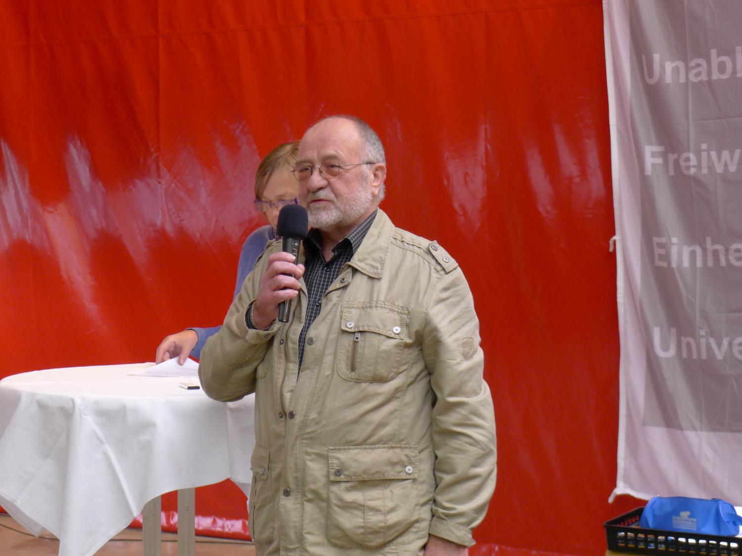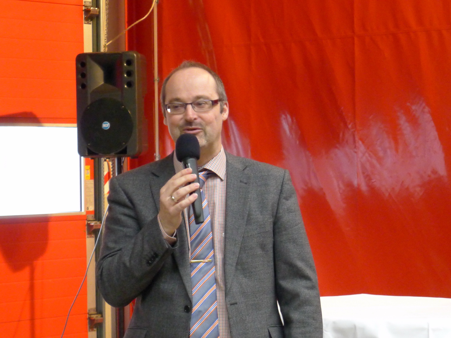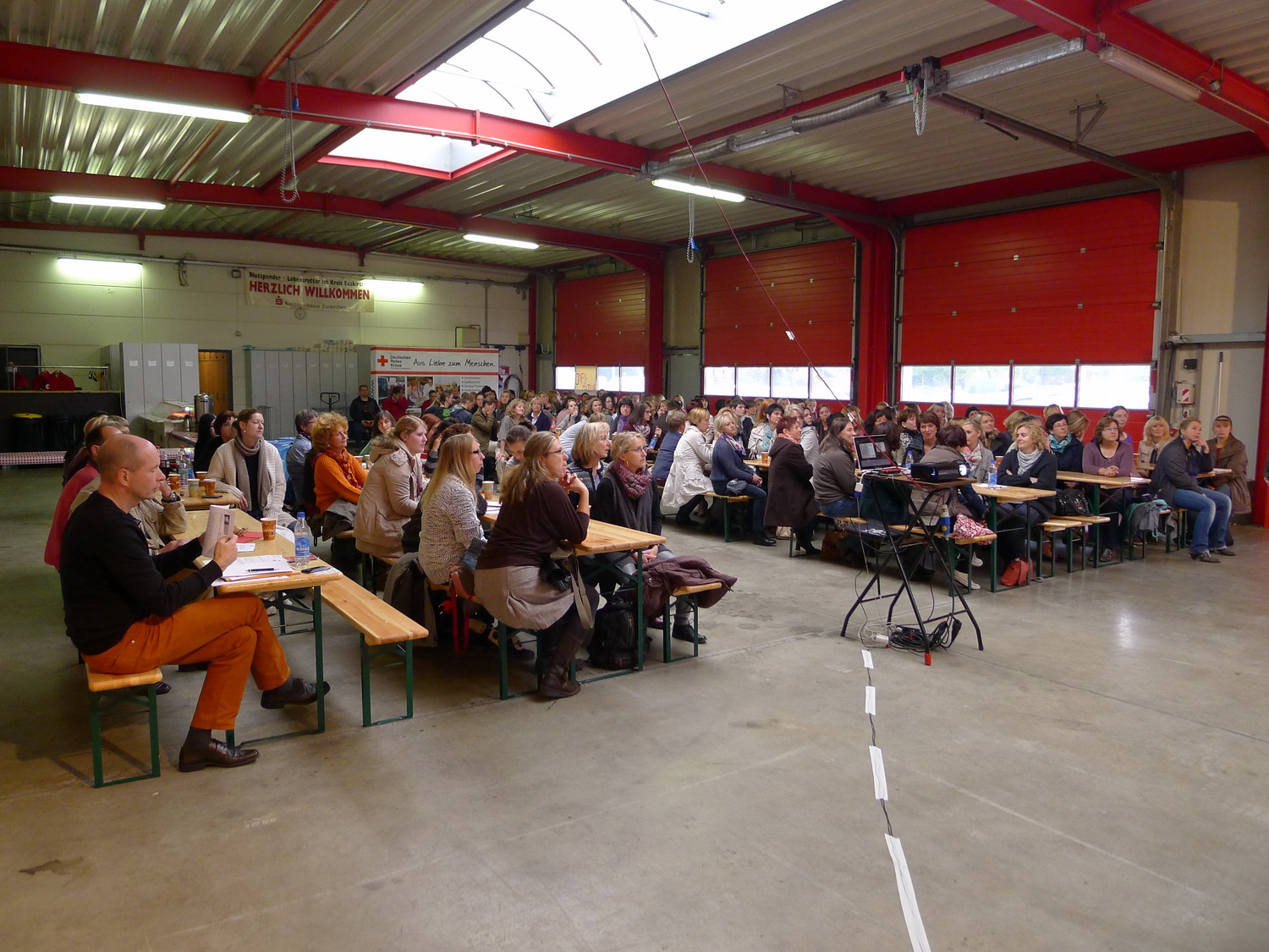 In der umfunktionierten Fahrzeughalle des Rotkreuz-Zentrums fanden sich heute zahlreiche Angestellte zur diesjährigen Betriebsversammlung ein. Beate Kruse, Vorsitzende des Betriebsrats, führte durch die Veranstaltung.