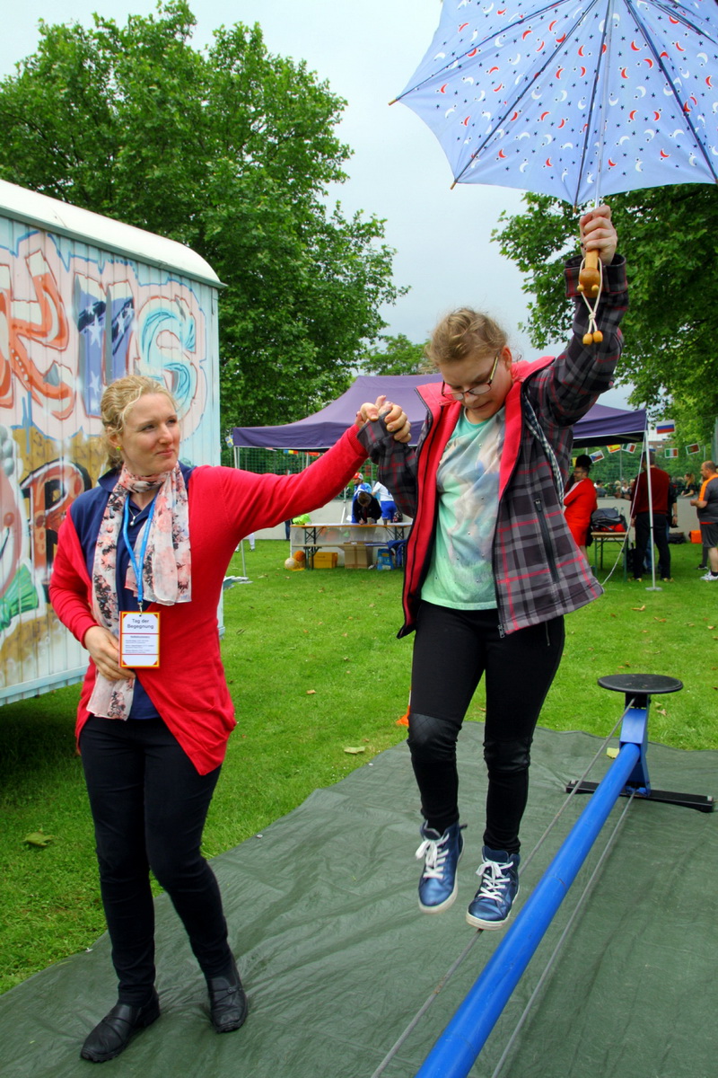 Ein Beispiel für ein gelungenes Projekt dieser Art war das Zirkusprojekt, das die Caritas, die Lebenshilfe, die Nordeifel-Werkstätten und die Zülpicher Karl-von-Lutzenberger-Realschule in der Woche vor dem Fest veranstaltet hatten. 16 Teilnehmer, darunter Schüler und einige junge Menschen mit Behinderung, erarbeiteten eine Woche lang mit Thomas Stihl von der Suchtprävention der Caritas und Thomas Münnix von der Kölner „Zirkusfabrik“ ein Programm, das auf dem Tag der Begegnung präsentiert wurde. „Man muss darauf achten, dass sich jeder gleich viel einbringen kann“, erklärte Münnix. Jeder solle zeigen können, was er gelernt habe. Das klappte dann schon am Stand wunderbar, wo die Teilnehmer den vielen neugierigen Gästen ihre Kunststücke zeigen konnten.