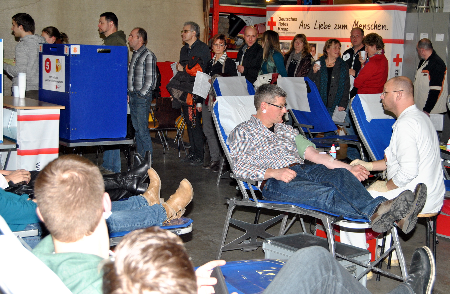 Mit zwei Teams war der Blutspendedienst West angereist und sorgte mit 18 Mitarbeitern und sieben Ärzten dafür, dass trotz des enormen Andrangs keine übermäßig langen Wartezeiten für die Blutspender entstanden. Alle Hände voll zu tun hatte auch das Küchenteam: Unermüdlich schleppten die Frauen Schüsseln und Platten in den Versammlungsraum, wo sich alle, die Blut gespendet hatten, am kalten und warmen Buffet stärken konnten. Vor der Spende versorgte Dieter Pape, langjähriger Rotkreuz-Ehrenamtler und selbst 150-facher Blutspender, die Wartenden mit Getränken. Wer nicht wollte, wurde sanft genötigt: „Sie müssen.“ Selbst dürfe er aus Altersgründen nicht mehr spenden, so Pape, aber: „Helfen tue ich gerne.“