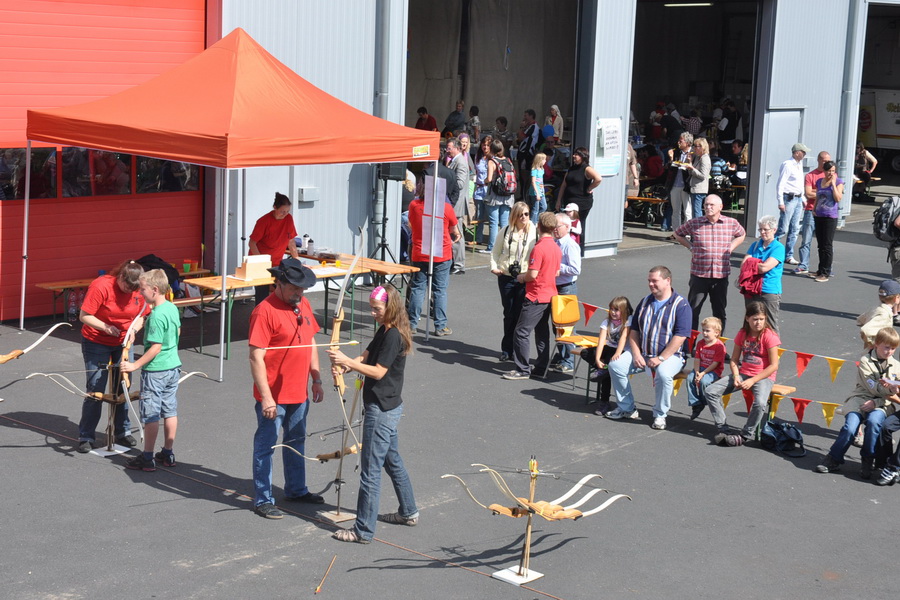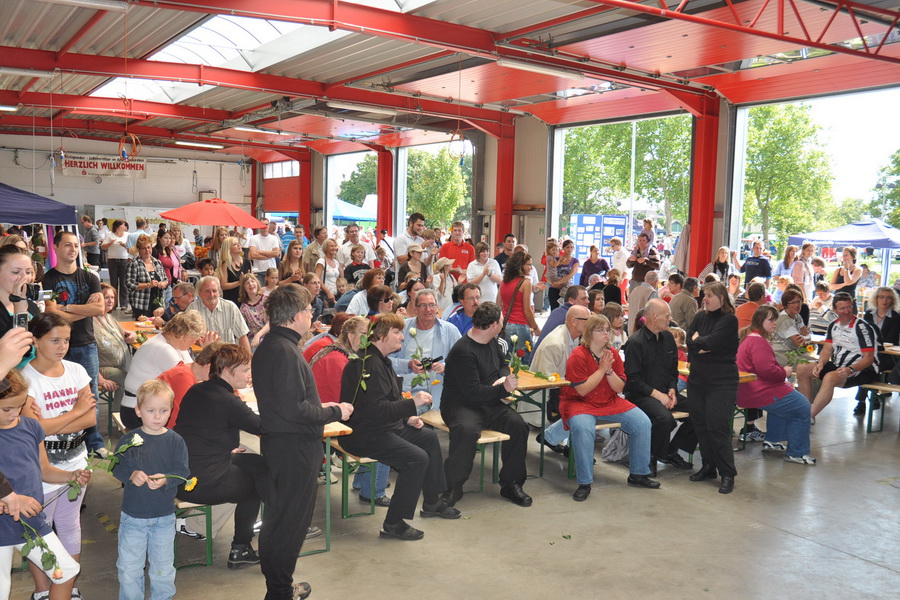 Hunderte von Menschen kamen zum Rotkreuz - Zentrum, um das umfangreiche von Norbert Jeub (Radio Euskirchen) moderierte Bühnenprogramm zu sehen. In der großen Fahrzeughalle knubbelte es sich. Hier wurde unter anderem ein Schwarzlicht-Theater aufgeführt, die „Sweet Heart Band“ der Lebenshilfe zeigte ihr Können und der deutsch-türkische Kinder- und Jugendchor, der seine Lieder beim Roten Kreuz einstudiert, sang neben anderen Liedern auch die Rotkreuz-Hymne „Together hand in hand“. Eine türkische Tanzgruppe lud nicht nur zum Mittanzen ein, die Ensemblemitglieder verschenkten an die Besucher auch Blumen. Am späten Nachmittag sorgten die jungen Musiker der Marienschule mit ihrer Schülerband für Riesenstimmung.