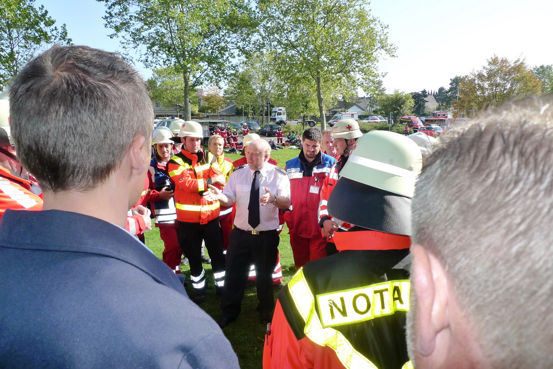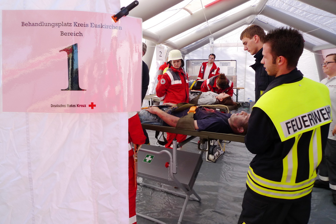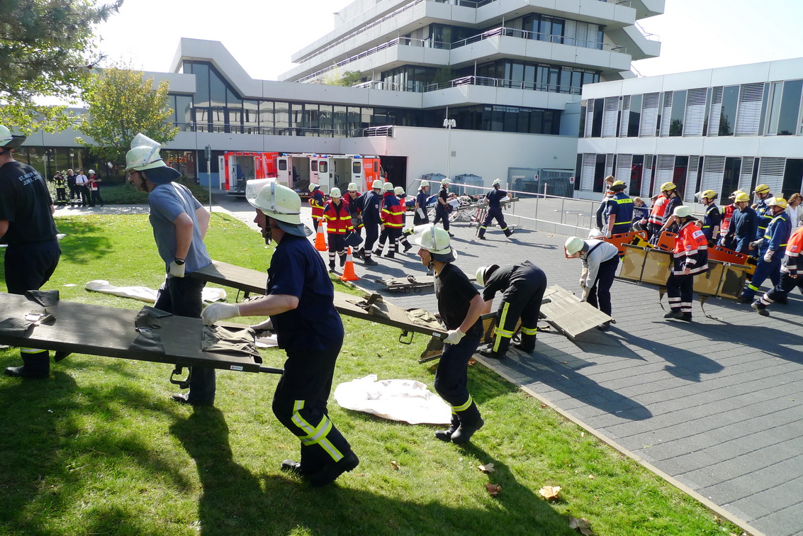 Lautes Geschrei ertönte gegen 13.20 Uhr auf dem Gelände vor der Kreisverwaltung in Euskirchen: Glücklicherweise war es nur eine Übung. Es wurde das Szenario einer Explosion der Kreisverwaltung nachgespielt. Bei der Übung für Leitende Notärzte und Organisatorischen Leiter waren rund 60 Mimen beteiligt, die von Feuerwehr, Malteser, Technisches Hilfswerk und dem Deutschen Roten Kreuz in guter Zusammenarbeit "versorgt" wurden.en.
