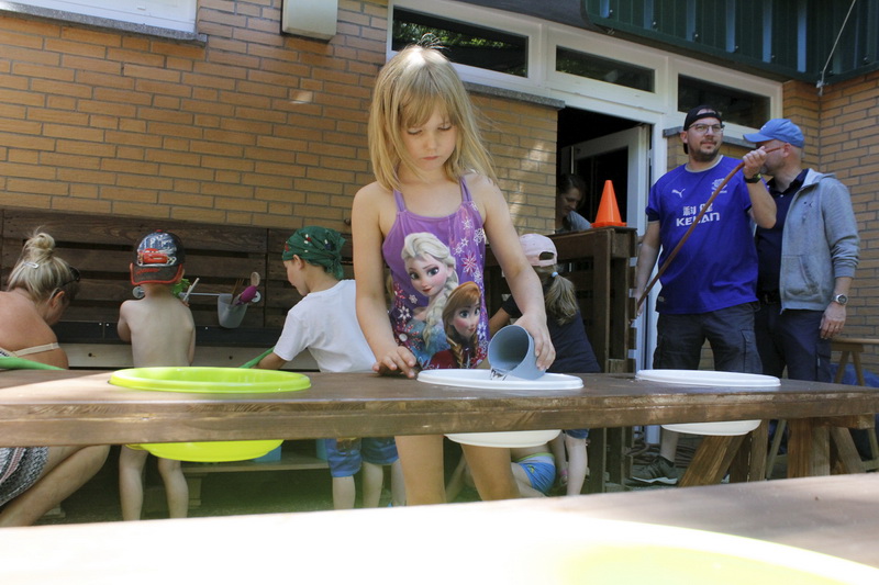 Kräftig gepumpt wird natürlich auch an der „Bütt“. Förmchen, Töpfe und Sand werden schnell gebracht. In der Küche werden derweil phantasievolle „Kuchen“ gebacken und herzhafte „Suppen“ gekocht. Für Kinder gibt es doch nichts Schöneres als mit Wasser ausgiebig zu matschen.