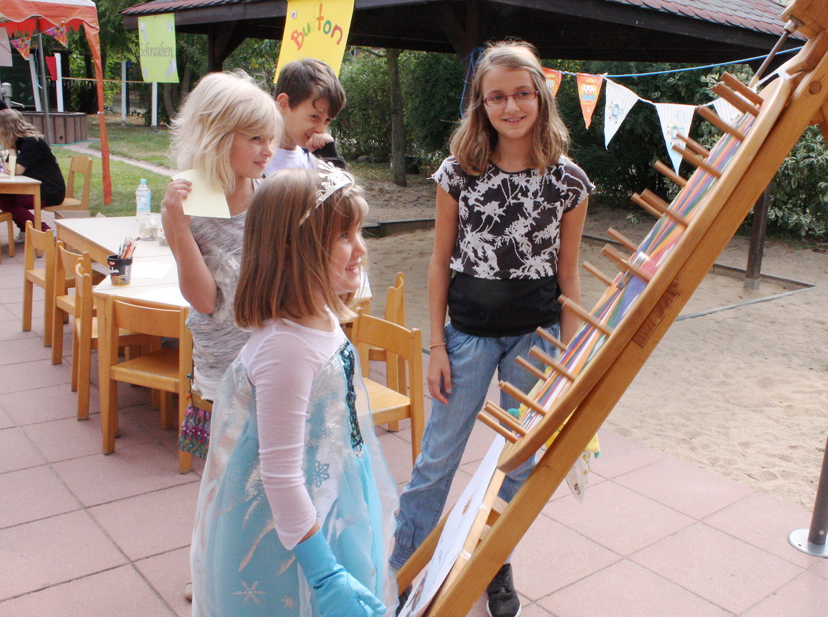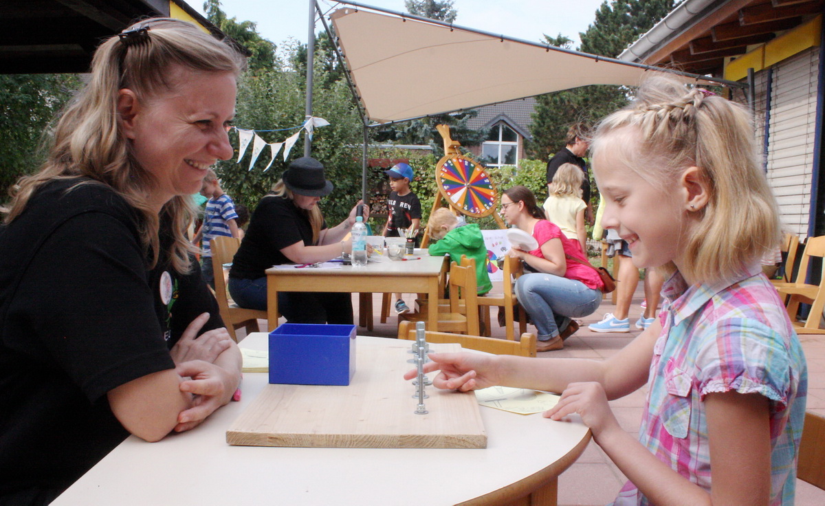 Sogar Maskottchen Fridolin die Vogelscheuche hatte eigens für das Fest hübsche neue Kleider und sogar eine goldene Krone bekommen. Selbst gebastelt hatten die Kinder außerdem die Lose für die Tombola. Zu den Hauptgewinnen zählten neben zwei Freikarten für das Phantasialand auch ein Rundflug mit der Ultraleicht-Fluggruppe „Nordeifel“. „Das sind unsere Paten“, erzählte Conny Valerius. „Alle zwei Jahre veranstalten wir ein gemeinsames Sommerfest, an dem die Kinder kostenlos mitfliegen dürfen. Da fliegen unsere Spatzen durch die Lüfte.“