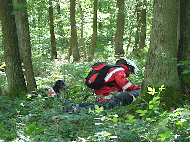 Zunächst stand die schriftliche Prüfung für den Hundeführer auf dem Prüfungsprogramm, ehe Mensch und Hund gemeinsam die Teilprüfungen Verweisen (das sichere Anzeigen einer liegenden Person durch lautes, anhaltendes Bellen), diverse Gehorsamsübungen und der abschließenden Flächensuche in einem 30.000 Quadradmeter großen Waldstück, in dem zwei Versteckpersonen aufgespürt und sanitätsdienstlich versorgt werden müssen.