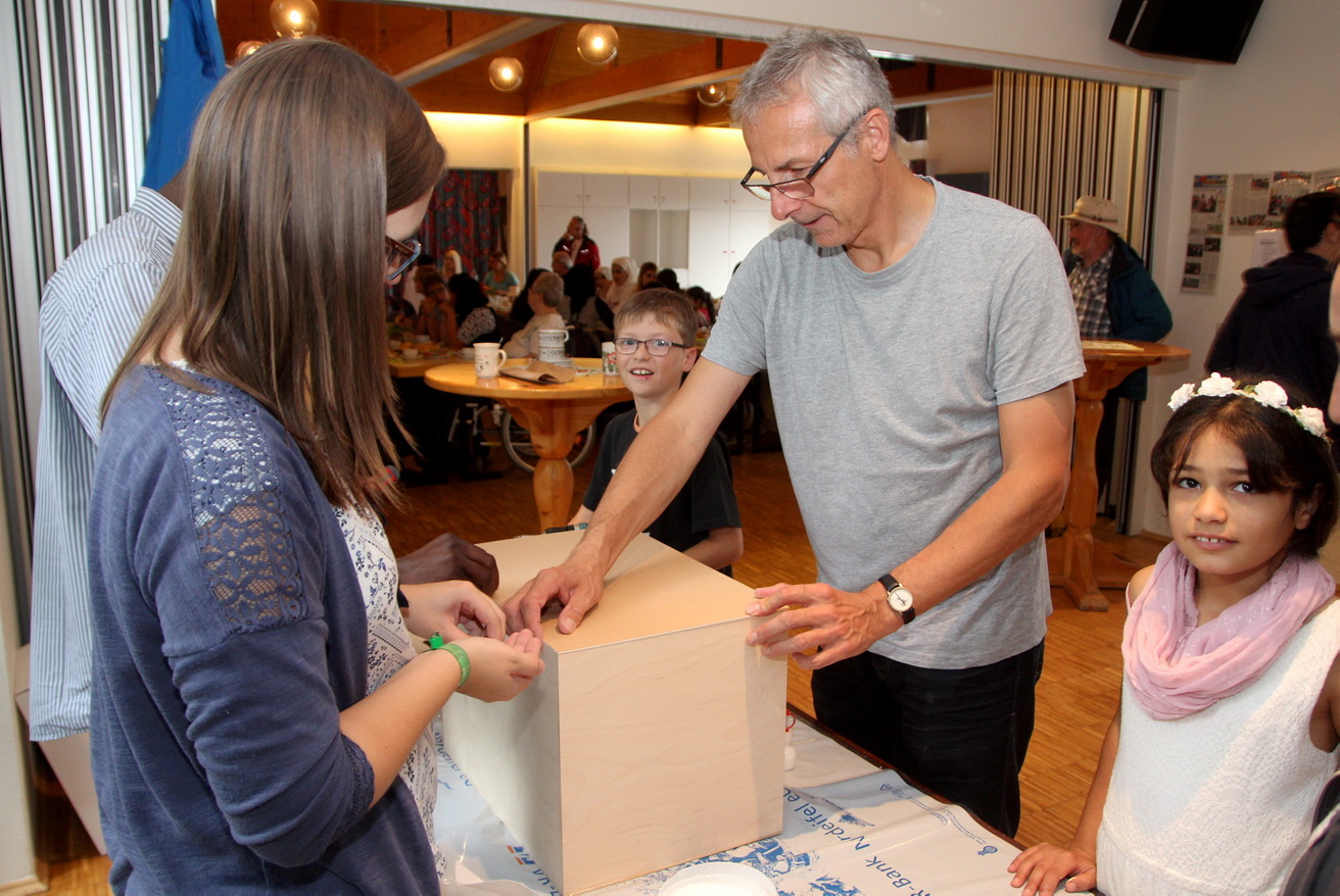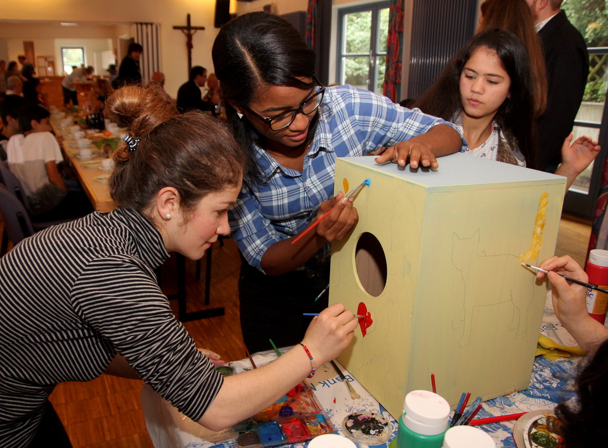 Anschließend wurde das optisch triste Instrument an Maf Räderscheidt und Sabine Heines vom „You Are Welcome“-Projekt übergeben. Alina, Sama, Walid, Jumna und Mayssam waren fünf der Kinder, die ihrer Kreativität vor den Augen der Besucher des Begegnungscafés freien Lauf lassen und sich auf den fünf sichtbaren Seiten der Cajóns künstlerisch austoben durften. Sie malten unter anderem eine Katze, Herzen und Blätterranken. Zum Abschluss nimmt die Künstlerin Maf Räderscheidt die Kistentrommeln mit nach Hause, wo sie abgeschliffen werden.