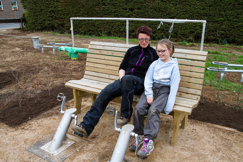 Auf dem Platz ist denn auch schon so einiges zu sehen: Auffällig sind unter anderem die fest montierten Fahrradpedale vor den Sitzbänken. Während der Nachwuchs sich an den Spielgeräten austobt, brauchen Eltern und Großeltern demnächst nicht mehr nur untätig herumzusitzen, sondern sie können ebenfalls etwas für ihre Gesundheit tun. "Ich habe diese Einrichtung in einem englischen Park gesehen", berichtete Schmitz. "Die Pedale vor den Sitzbänken wurden dort so gut angenommen, dass ich mir dachte, so etwas brauchen wir auch in Kall."