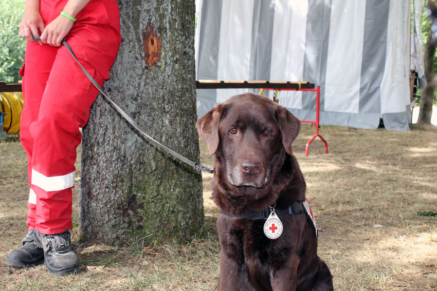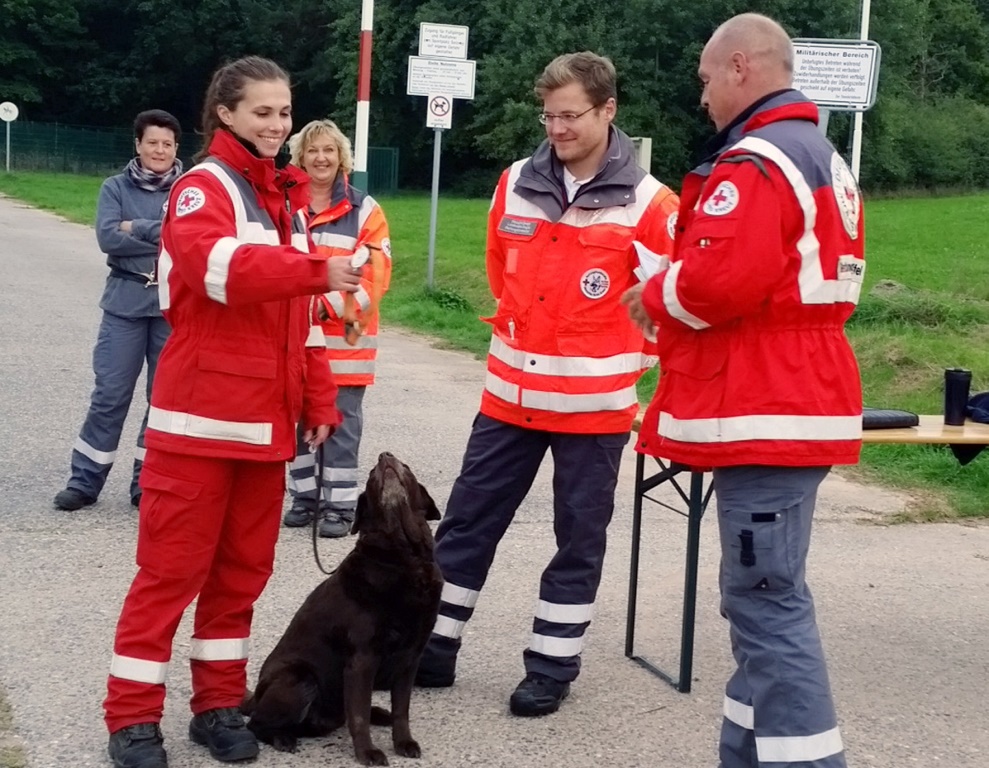 Bereits am frühen Samstagmorgen trafen sich die Rotkreuzler in der Schavener Heide bei Mechernich-Firmenich. Zunächst mussten alle Prüflinge ihr theoretisches Wissen im Fachfragentest unter Beweis stellen. Anschließend war die so genannte „Verweisprüfung“ abzulegen, bei der der Hund ein fehlerfreies Verhalten an einer gefundenen Person zeigen musste. Danach zeigten die Teams ihren Gehorsam, in der es auf eine harmonische und freudige Arbeit zwischen Mensch und Hund ankam und saubere, technische Elemente aus der Bewegung gezeigt werden mussten. Zum Abschluss des ersten Prüfungsteils wurden alle Hunde von einer fremden Personen getragen.