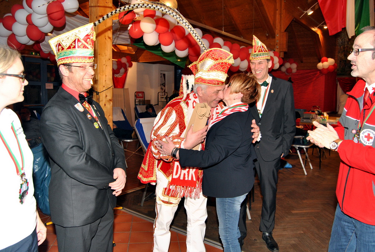 Seinem und dem Appell der Rotkreuzler waren immerhin exakt 100 Blutspender gefolgt. „Täglich werden in Deutschland zirka 15.000 Blutspenden benötigt für Operationen, aber auch zur Behandlung von Krebspatienten“, erklärte Rolf Klöcker, DRK-Kreisgeschäftsführer und Vorsitzender des Mechernicher Ortsvereins in einer Person, den hohen Bedarf und warum es dem Roten Kreuz ein so dringendes Anliegen ist, insbesondere auch jüngere Menschen vom Sinn dieses Engagements zu überzeugen. Den Kommerner Karnevalisten waren Klöcker und seine Mitstreiter daher dankbar, dass sie den dritten närrisch angehauchten Aderlass im Stadtgebiet Mechernich unterstützen. „Das ist eine Ehrensache. Jeder von uns könnte einmal auf Spenderblut angewiesen sein“, sagte Prinz Rolf III.
