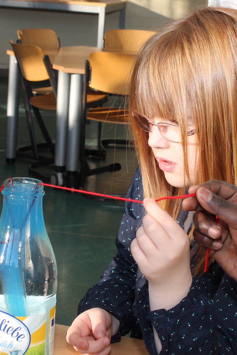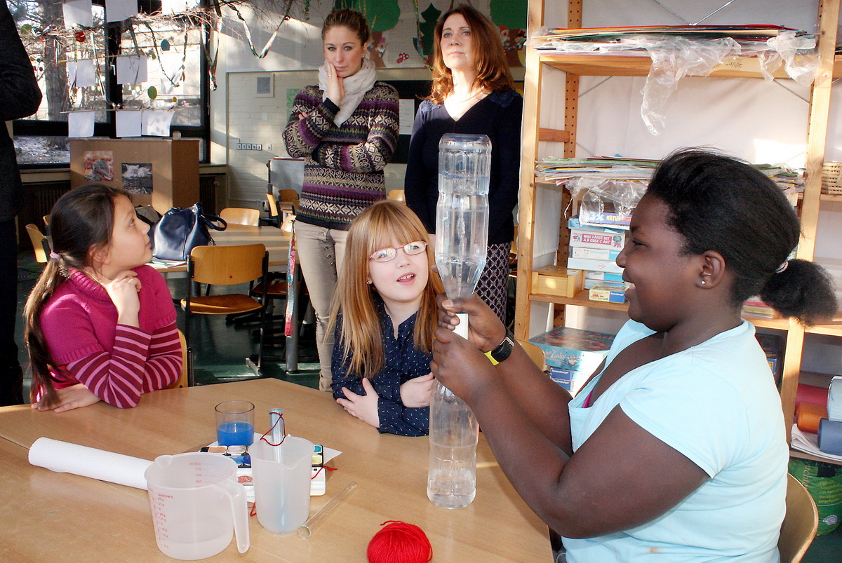 Zusammen mit ihrer Kollegin Iris de Jong und OGS-Leiterin Vera Schröder führt sie nachmittags mit einer etwa zehnköpfigen, jahrgangsübergreifenden Gruppe von Schülern unterschiedliche Versuche aus dem „Haus der kleinen Forscher“ durch. Geforscht wurde zum Beispiel mit Luft und Wasser sowie aktuell mit Magnetismus.