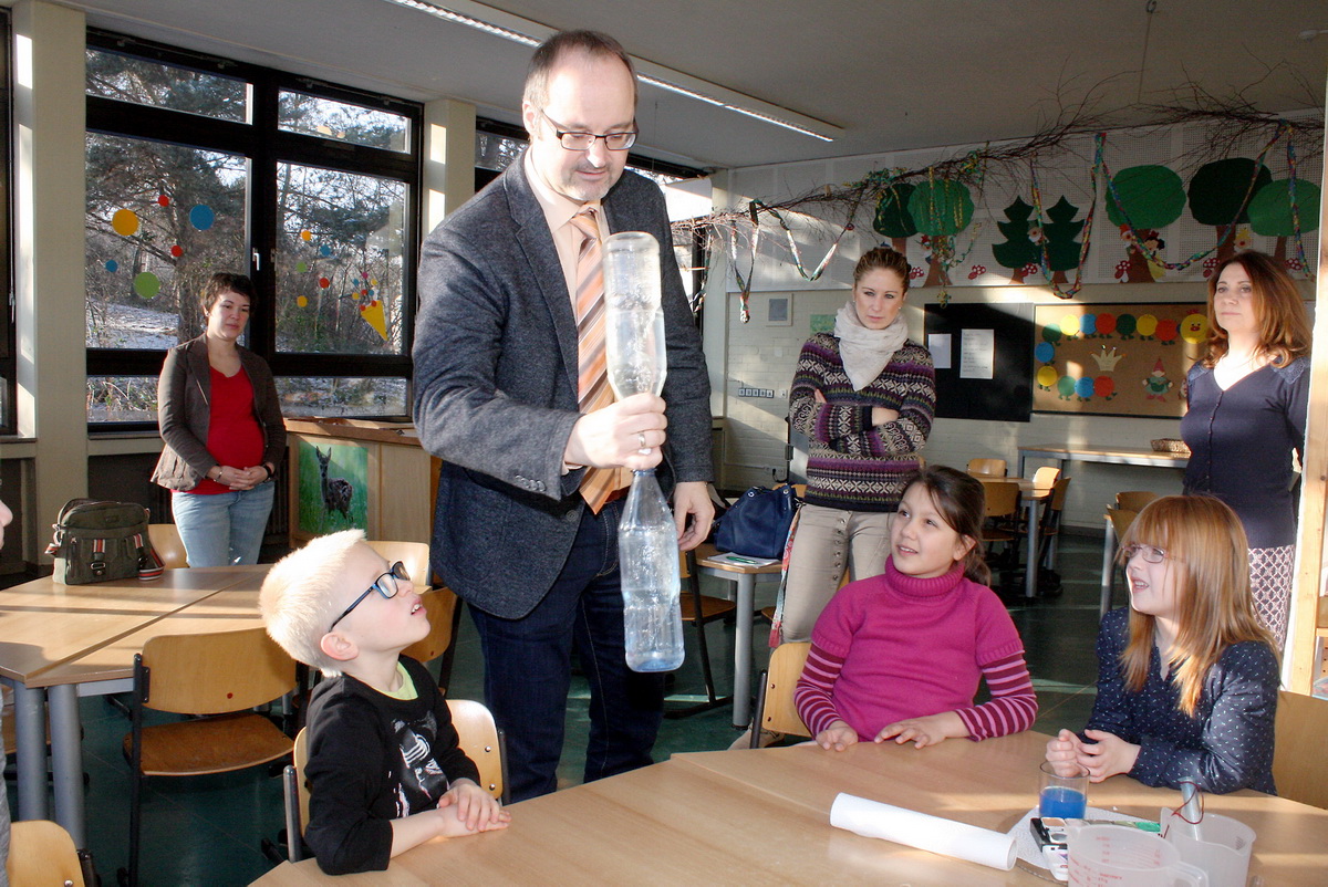 Rolf Klöcker, lokaler Netzwerkkoordinator im „Haus der kleinen Forscher“, überreichte Urkunde und Plakette an Schulleiter Ulrich Lindner-Moog. Zu diesem Anlass zeigten einige Kinder, wie sie forschen und experimentieren, um Phänomenen aus dem Alltag auf den Grund zu gehen.