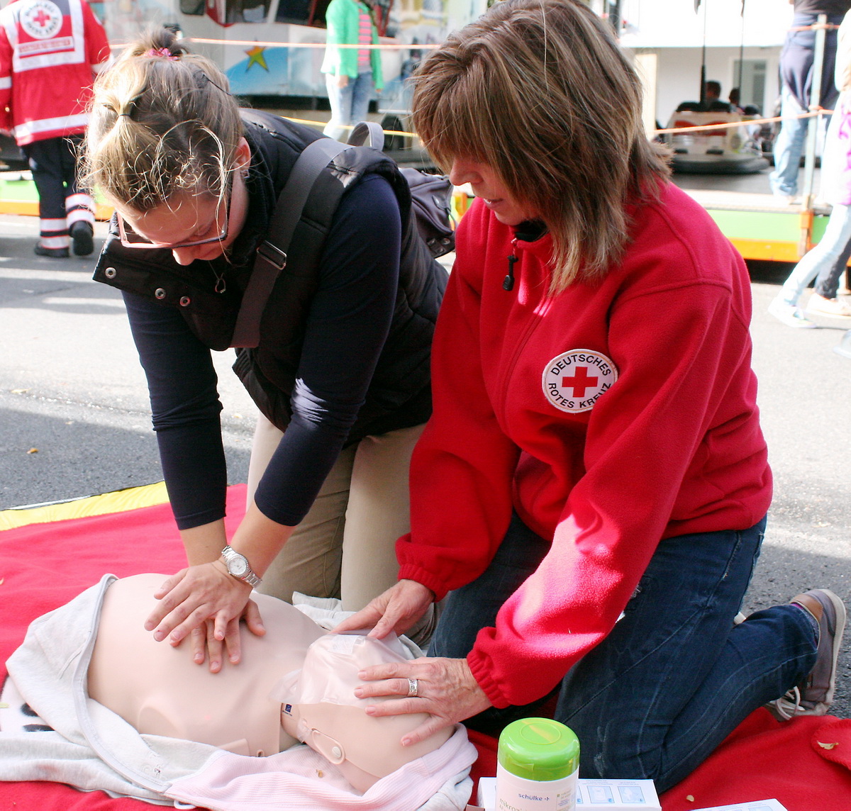 Um Hilfe in Notlagen ging es auch am Rotkreuz-Pavillon gegenüber dem Autoscooter. Während der Sanitätsdienst des Deutschen Roten Kreuzes zum Glück nur kleinere Wehwehchen zu verarzten hatte, konnten Besucher an einer Puppe lernen, wie man im Ernstfall eine Herz-Lungen-Wiederbelebung durchführt. „Das ist die einzige Möglichkeit, dem Betroffenen eine Chance zu geben“, erklärte Ute Michaelis, Erste-Hilfe-Ausbilderin vom Roten Kreuz im Kreis Euskirchen, und fügte hinzu: „Wenn es um die Kenntnisse in Erster Hilfe geht, gibt es aber noch einen großen Nachholbedarf.“