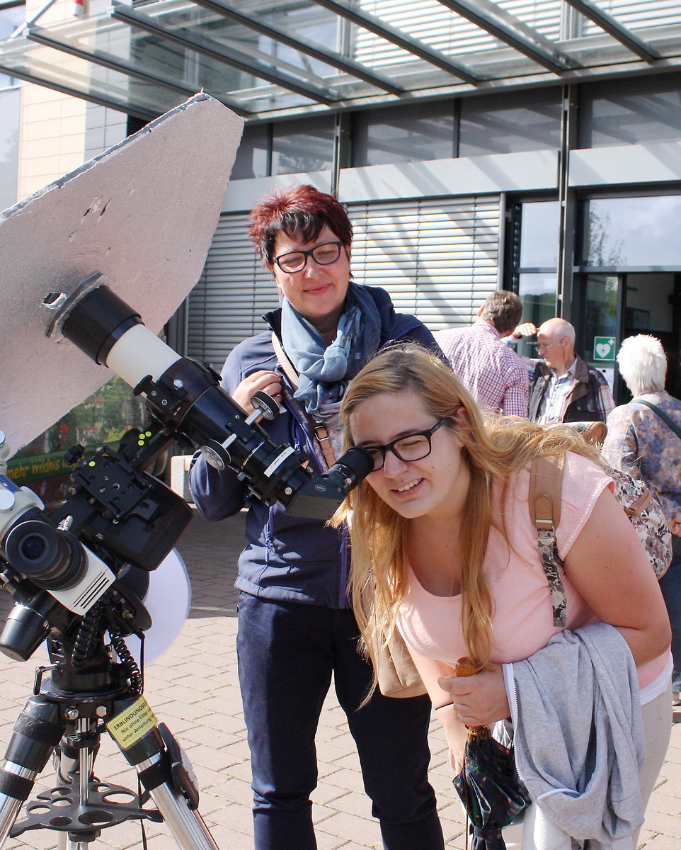 Einen guten Platz hatte sich der Astronom Harald Bardenhagen von der Sternwarte der Astronomen-Werkstatt „Sterne ohne Grenzen“ in Vogelsang IP ausgesucht. Vor dem Mechernicher Rathaus hatte er einige Gerätschaften aufgebaut, mit denen Interessierte die Sonne beobachten konnten. „Bei Regen sind die Leute ins Trockene geflüchtet und haben sich unsere Ausstellung im Rathaus angesehen. Und wenn sich die Wolken verzogen haben, konnten sie bei uns die Sonne beobachten“, so Bardenhagen.