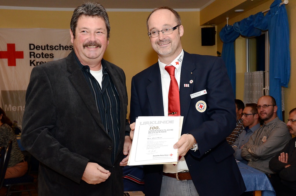 Der Rotkreuz-Kreisvorsitzende Karl-Werner Zimmermann („Ehre, wem Ehre gebührt“) erinnerte die 34 am Freitag zu ehrenden Blutspender daran, dass jeder von ihnen, die 25, 50, 75 und 100mal je einen halben Liter Blut gespendet haben, damit vermutlich mehrfach zu „anonymen Lebensrettern“ geworden sind. Denn die Blutkonserven würden bei ihrer Aufbereitung im Blutspende-Zentrum West/Institut für Transfusionsmedizin in Breitscheid in mehrere Fraktionen einzelner Blutbestandteile zerlegt. Jeder Patient bekomme „nur“ genau die Blutspende, die er für sein jeweiliges Krankheits- oder Verletzungsbild braucht.