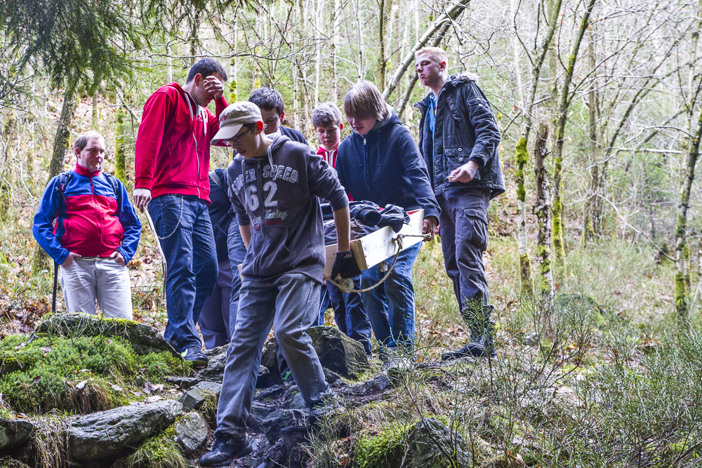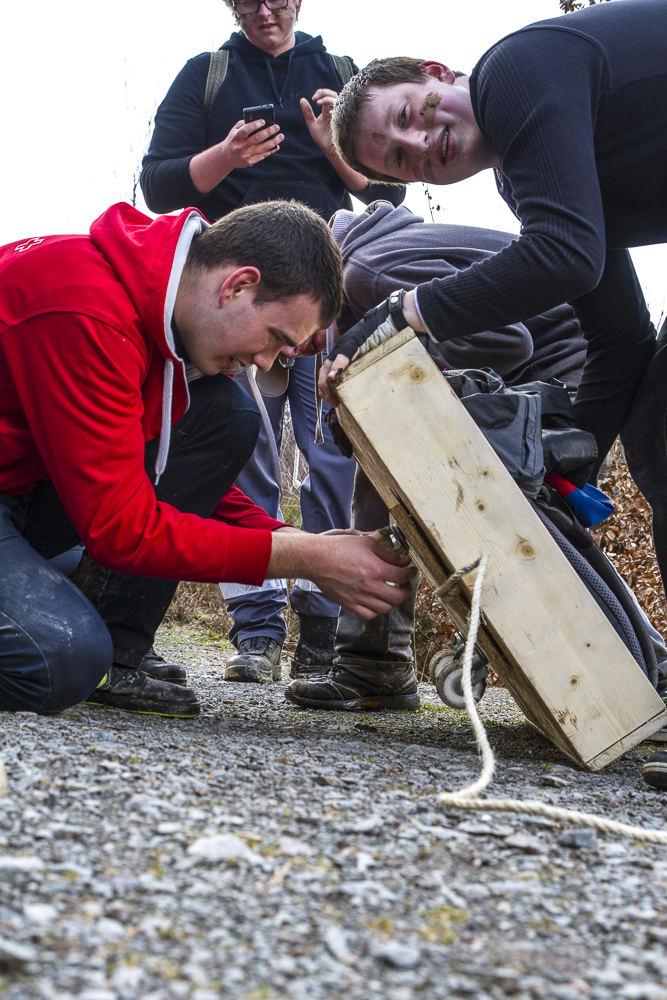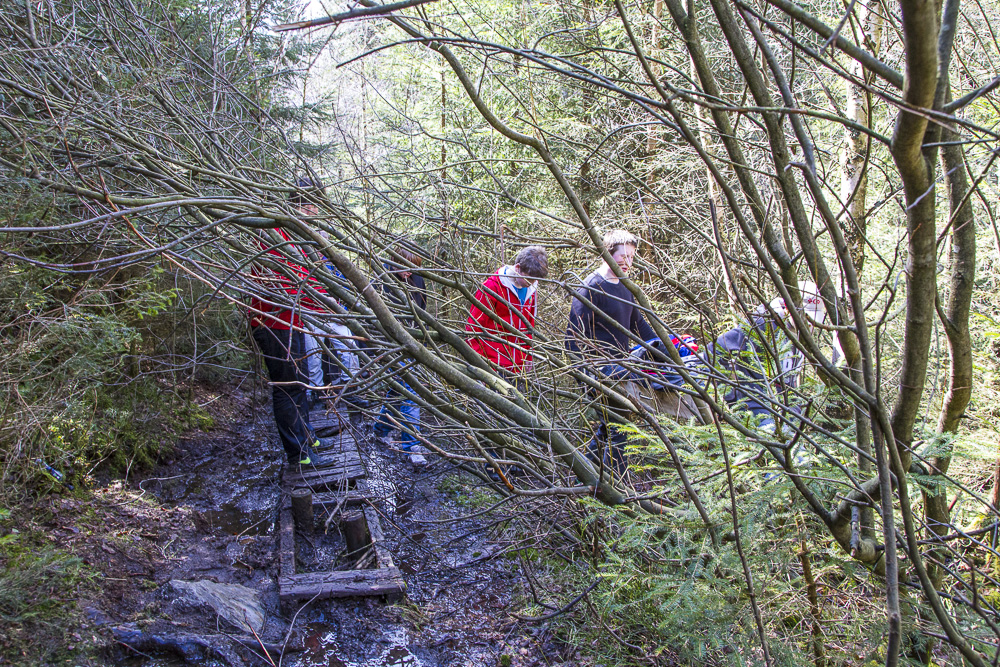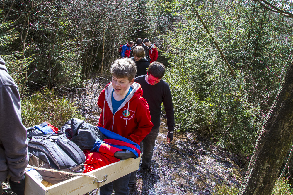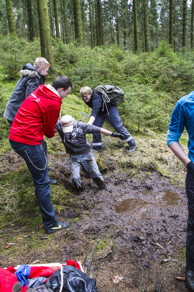Über Stock und Stein, durch Bäche und über marode Stege, durch tiefe Sumpflöcher oder auch nur mal auf Grasbücheln kämpften die Jungs sich gemeinsam durch die Natur. Dabei natürlich auch immer ein Auge auf den Transportwagen mit Verpflegung und Kleidung.