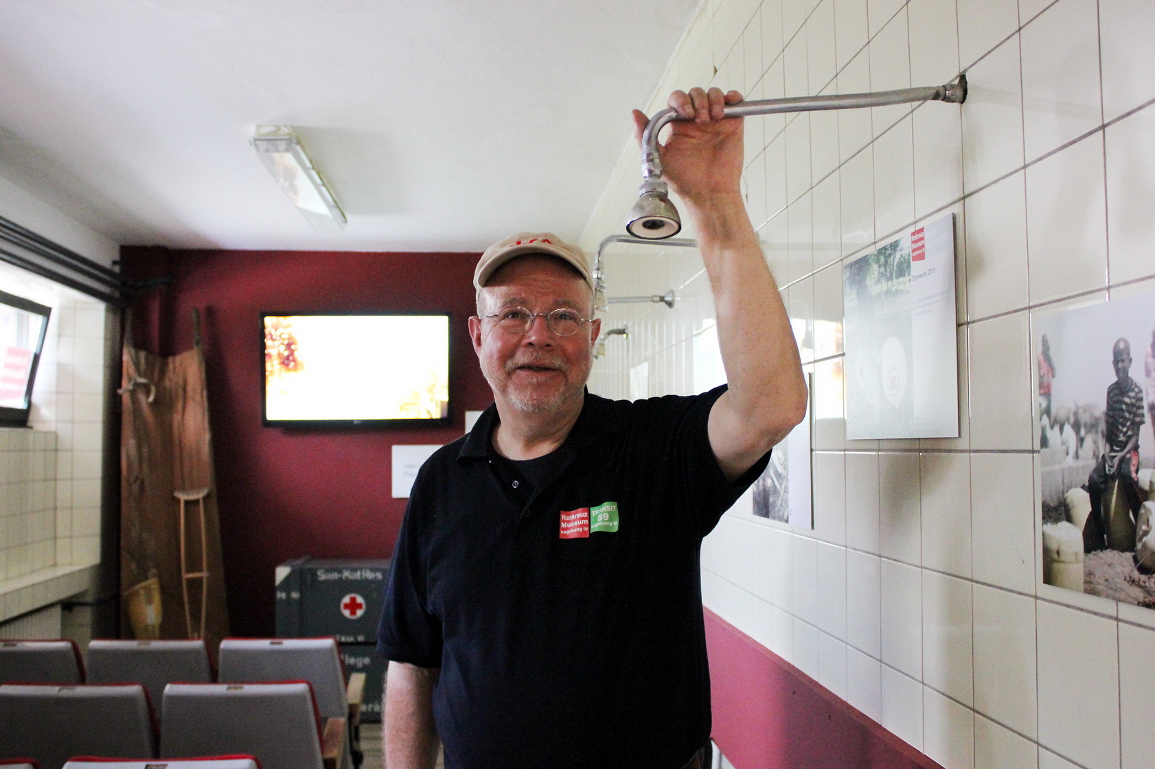 Immer wieder zeigt sich beim Rundgang auch, mit welcher Liebe zum Detail und welch kreativem Potenzial die Ausstellung konzipiert wurde. In den ehemaligen Duschräumen des Gebäudes etwa wurde ein Vorführraum eingerichtet, der mit Sitzen aus dem ehemaligen Gemünder Kino ausgestattet wurde, und in dem die Duschköpfe nach wie vor aus der Wand ragen. Zimmermann. „Dass wir immer wieder auch den Urzustand des Gebäudes mit einbeziehen, freut auch den Denkmalschutz.“ Die Geschichte des Roten Kreuzes erzählen unter anderem historische Feldtelefone. Hebt man den Hörer ab, startet ein „mp3-Player“, der die Historie mittels eines WDR-Beitrags nachzeichnet.