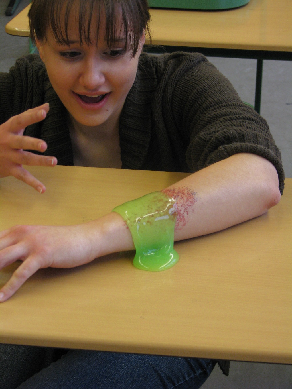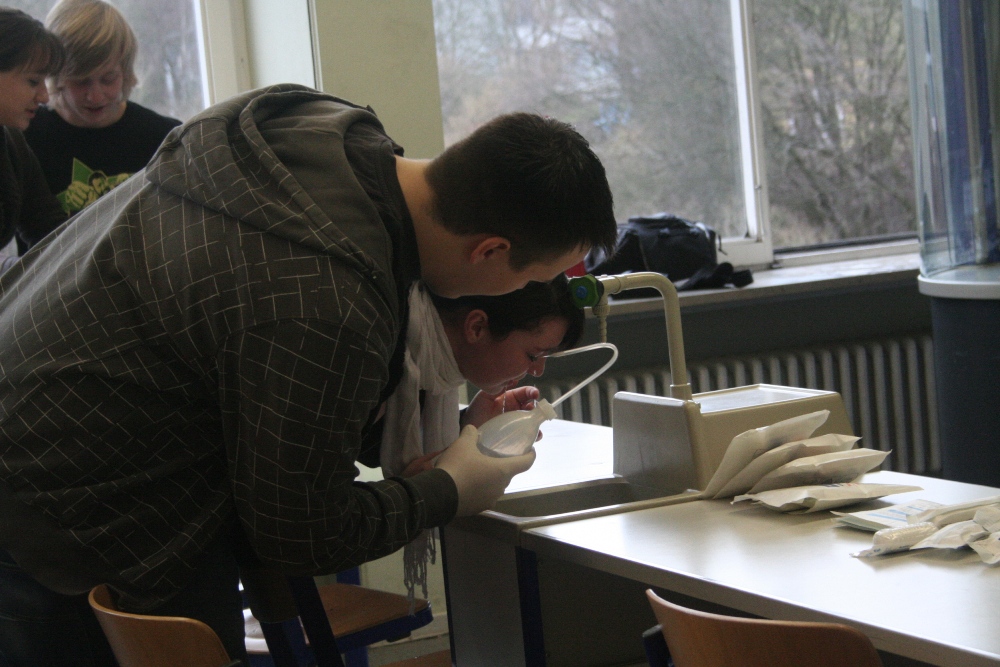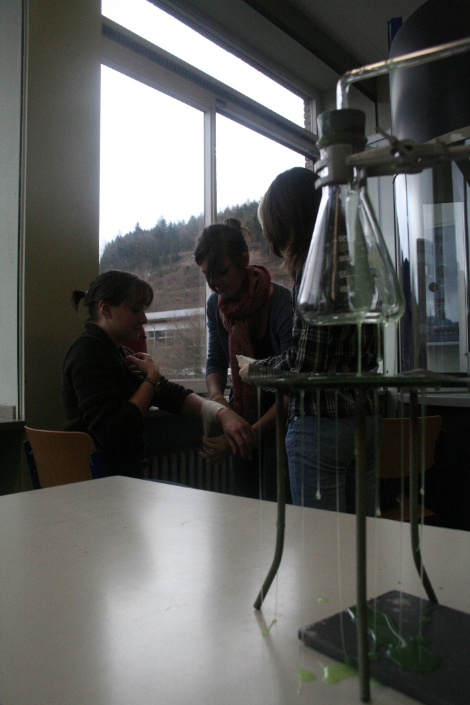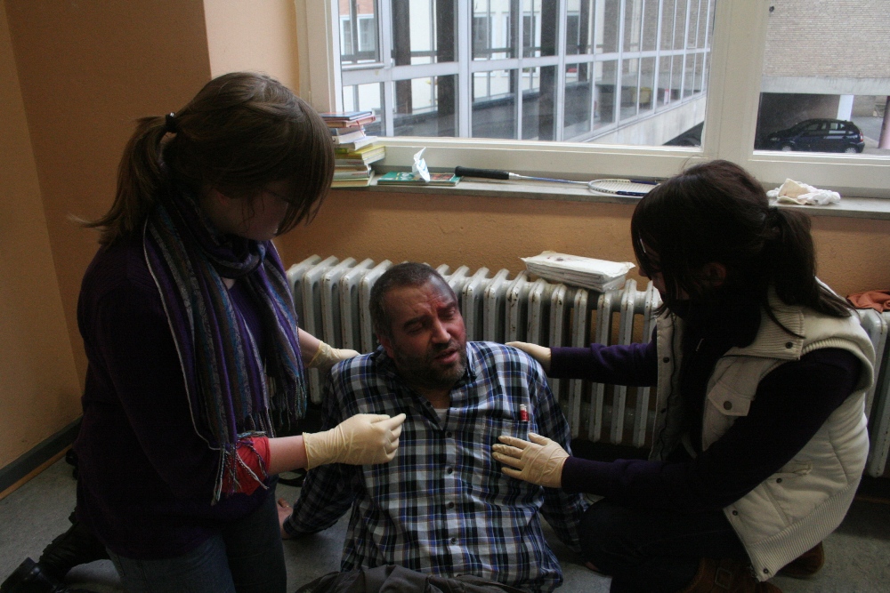 Im praktischen Teil des Wettbewerbs zog es die Schulsanitäter zu drei verschiedenen Unfallsituationen, die sie selbstständig und eigenverantwortlich lösen mussten. Bei dem Sportunfall galt es Schürfwunden zu verbinden, einen Bruch zu erkennen und zu versorgen sowie eine aufgeregte Patientin zu beruhigen. An anderer Stelle hinterließ ein Blitz Brandwunden an Kopf und Armen, und an einem Bewusstlosen wurde die stabile Seitenlage abgefragt. Im Chemieraum war ätzende Flüssigkeit über einen Arm gelaufen und in ein Auge gespritzt. Außerdem atmete eine Laborantin die giftigen Gase des Stoffes ein und hatte Brechreiz. Schiedsrichter bei den verschiedenen Fällen waren der Beauftragte für den Sanitätsdienst des Städtischen Gymnasiums, Herr Schröder, sowie die Beauftragten für den Sanitätsdienst des Clara-Fey-Gymnasiums Astrid Schmidt und Heike Jäckel.