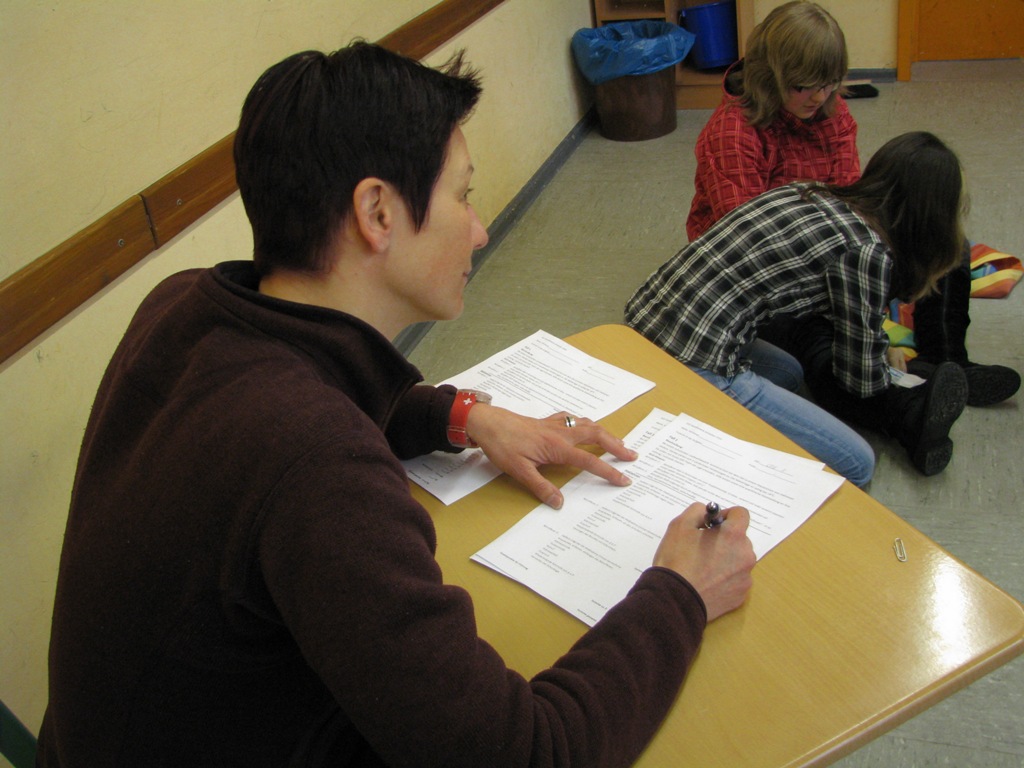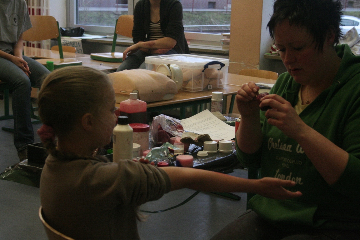 Zwar traten nur zwei Gruppen aus dem Clara-Fey-Gymnasium und eine des Städtischen Gymnasiums in Schleiden an, der Einsatz der Jungsanitäter wurde davon allerdings nicht gemindert. Während die Mimen, die die drei Unfallopfer darstellten, geschminkt wurden, absolvierten die Schüler, die trotz desWettbewerbtermins an einem Samstagmorgen erschienen waren, einen theoretischen Test. Die Räumlichkeiten stellte dieses Jahr das Städtische Gymnasium Schleiden zu Verfügung.