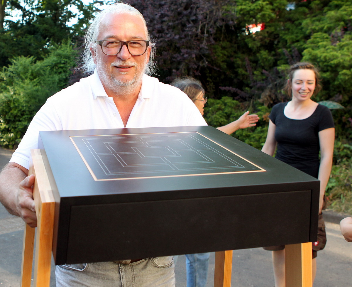 „Die Schüler haben das komplette Projekt durchgeplant und gefertigt“, sagte Lehrer Heinz-Georg Hecking, der mit Ausbilder Andreas Schneemann und den Auszubildenden in die Flüchtlingsunterkunft nach Gemünd gekommen war, um die Spieltische an das Rote Kreuz zu übergeben. Im Rahmen dieses Projektes ist vorgesehen, dass die Schüler ein Möbelstück in Kleinstserie herstellen und dieses – das Einverständnis des Betriebes vorausgesetzt – behalten dürfen. Die Tischlerklasse entschied sich aber für einen anderen Weg und baute nach der Idee von Schüler Sebastian Milda die Spieltische, speziell um sie an Flüchtlingsunterkünfte weitergeben zu können. Ausbilder Schneemann: „Eine wirklich großartige Idee.“ Da das Lackieren der Tische nicht im Rahmen des Kurses möglich war, stellten die Lehrlinge die Tische in ihrer Freizeit fertig.