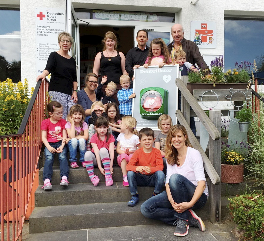 „Im Fall eines Herzkreislaufstillstandes muss man so schnell wie möglich reagieren, um Schäden am Gehirn zu vermeiden“, erklärt Michael Mahlberg vom Verein KinJu. Patrick Dost, Bereichsleiter Aus- und Weiterbildung beim Roten Kreuz im Kreis Euskirchen, ist froh über die Hilfe des Vereins: „Als Träger von mehr als 30 Kindertagesstätten ist es für das Rote Kreuz im Kreis Euskirchen schwierig, alle Einrichtungen selbst auszustatten.“