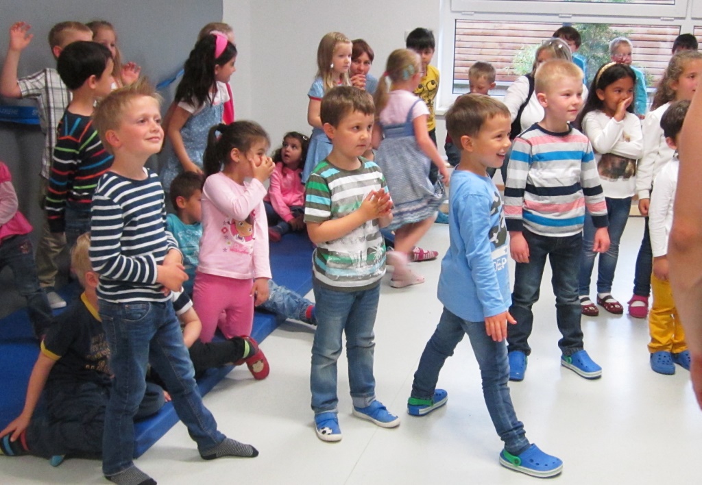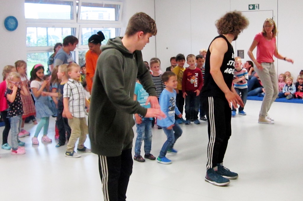 In der großen Turnhalle wurden dann allerhand „coole moves“ aus Hip-Hop und Breakdance ausprobiert. Besonders der Robotertanz hatte es den Kleinen angetan – und wurde den ganzen Tag nachgetanzt. Die Londoner Künstler zeigten sich ebenfalls beeindruckt: Die Spontanität und die ungewöhnlich hohe motorische Begabung der Kinder habe sie erstaunt, erzählten sie im Anschluss an den Workshop.