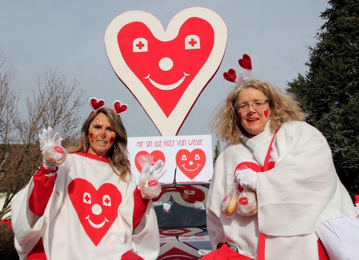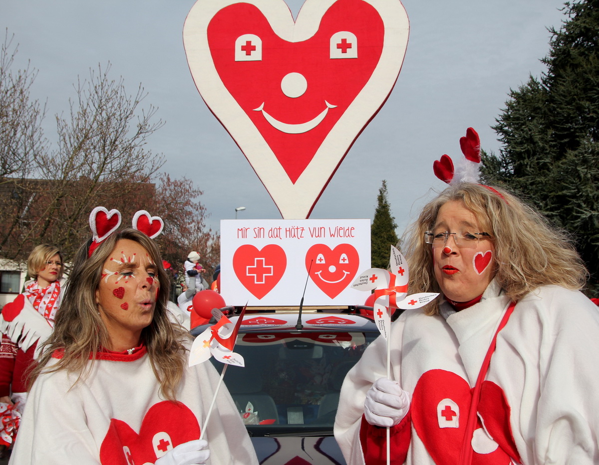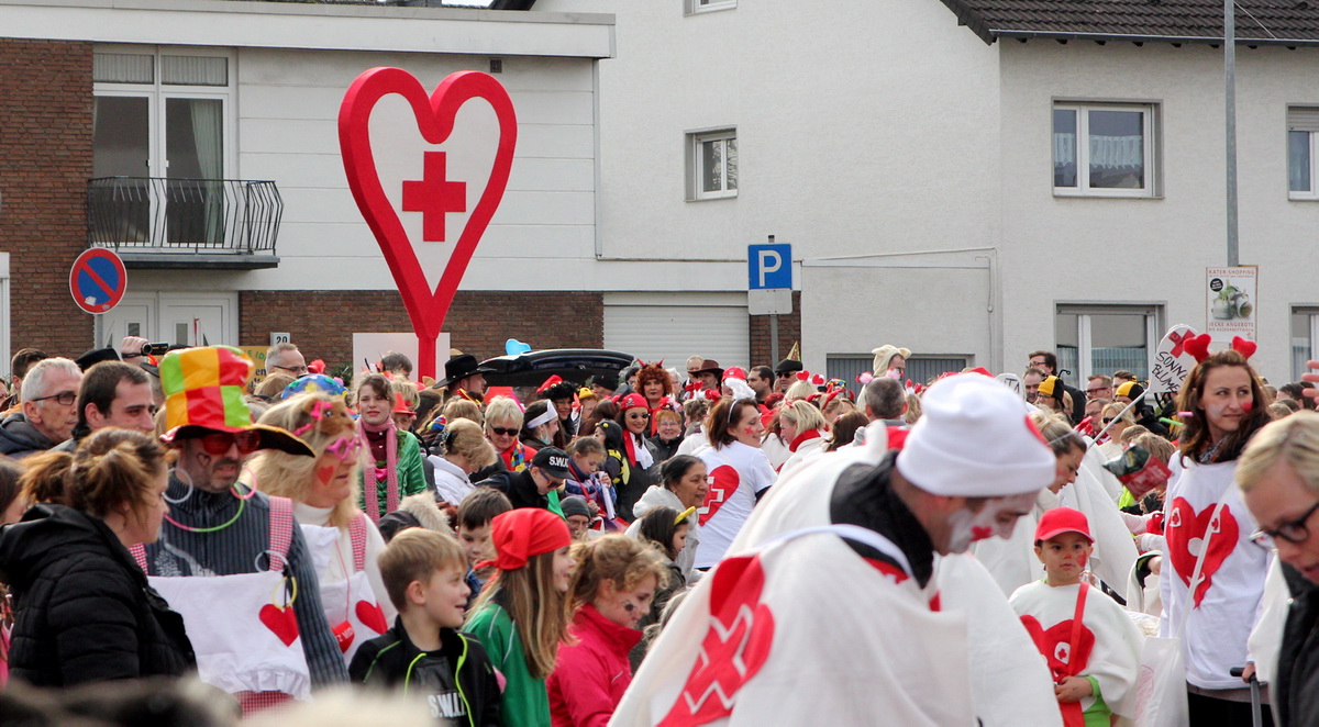 Weilerswist – Um zu erkennen, zu welcher Institution die 150 in weiße Ponchos gehüllten Teilnehmer des Weilerswister Karnevalszugs gehörten, musste man kein Prophet sein. Auf der Vorderseite waren rote Herzen, die Gesichter darstellten, abgebildet. Die Pupillen in den Augen dieses herzlichen Gesichtes bestanden aus roten Kreuzen. Wem dieses Detail entgangen war, der musste nur die Rücken der jecken Gruppenmitglieder betrachten: Mitten im Herz befand sich hier ein rotes Kreuz.