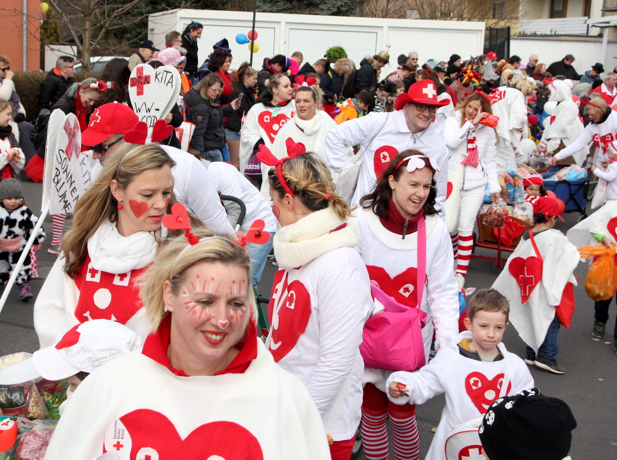 Das gehört natürlich zum Deutschen Roten Kreuz, in dem Fall zu den drei Kindertagesstätten Weilerswist-Süd, Sonnenblume (ehemals Bahnhofsallee) und Spatzennest in Groß-Vernich. Die stellten mit ihrer Teilnehmerzahl die zweitgrößte Gruppe des Karnevalszuges nach der Gesamtschule.