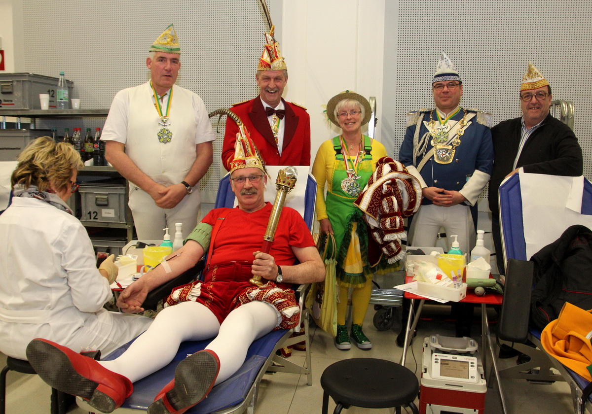Natürlich war die Tollität nicht der einzige jecke Blutspender. Auch die Präsidenten Gerd Wallraf (Hovener Jungkarnevalisten) und Horst Wachendorf (Prinzengarde) sowie weitere Mitglieder der Vereine ließen sich das kostbare Gut abnehmen. Hier und da sah man auf den Liegen im Forum immer wieder Menschen mit Narrenkappe auf dem Haupt und Kanüle im Arm. Der Karneval verbindet eben, besonders dann, wenn man ihn mit dem guten Zweck verbinden kann.