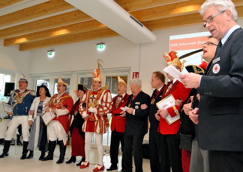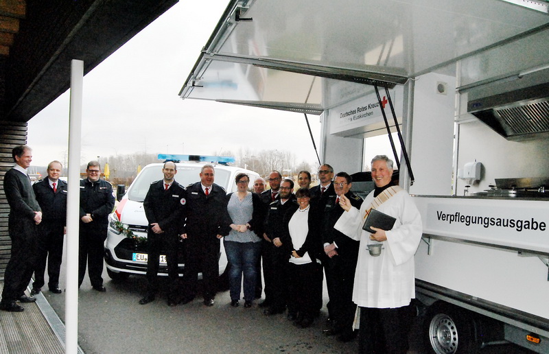 Nach einem Stelldichein des Zülpicher Prinzen Heinz-Willi I. (Pütz) und Prinzessin Gabi samt Gefolge durften die Gäste des Neujahrsempfangs wegen der frostigen Temperaturen die Einweihung zweier neuer Fahrzeuge aus dem Warmen heraus beobachten. Diakon Winfried Krämer und Pfarrer Ulrich Zumbusch segneten neben einem neuen Mannschaftsfahrzeug auch einen hochmodernen Anhänger für die Verpflegungsausgabe. Möglich gemacht hat die teure Anschaffung unter anderem eine Spende der Bürgerstiftung der Kreissparkasse. Dafür kann nun der alte „Küchenbus“, ein umgebauter und umlackierter, ausgemusterter RVK-Bus, nach 30 Jahren aufs Altenteil geschickt werden.