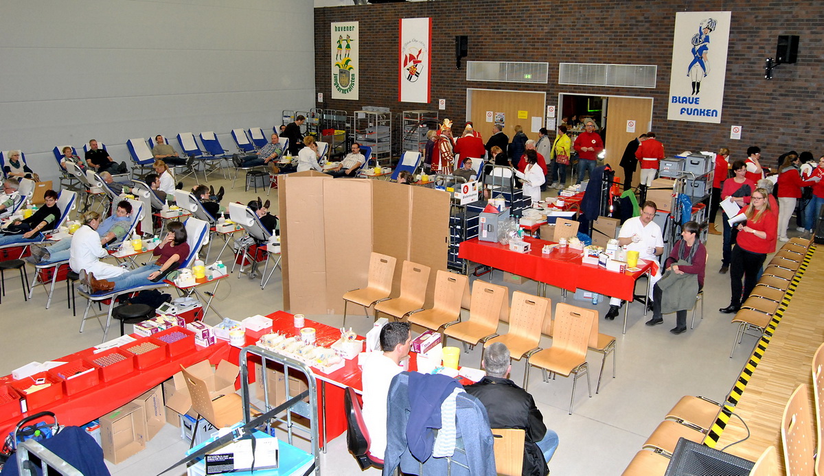 Mit Blutspende-„Events“ wie der Zülpicher Prinzenblutspende versuchen die Rotkreuz-Ortsvereine im Kreis Euskirchen, den dringend benötigten Nachwuchs bei den Blutspendern zu mobilisieren. Denn immer mehr der langjährigen regelmäßigen Blutspender müssen in den nächsten Jahren aus Altersgründen aufhören. „Und dann können Blutkonserven ganz schnell knapp werden, wenn niemand nachkommt“, sagt Zülpichs Gemeinschaftsleiter Thomas Heinen. Zirka 80 Prozent der Menschen brauchen mindestens einmal im Leben fremdes Blut oder daraus erzeugte Produkte, vor allem Krebspatienten, Unfallopfer oder Organtransplantierte. In Zülpich stellten die Verantwortlichen erfreut fest, dass viele junge Leute gekommen waren.