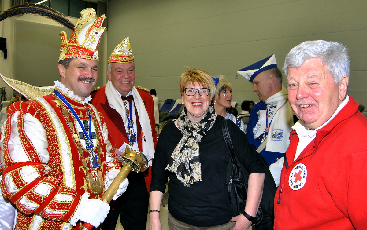 Besonders erfreulich war die hohe Anzahl an Erstspendern: 22 Männer und Frauen hatten sich zum ersten Mal dazu animieren lassen, einen halben Liter des dringend benötigten Lebenssaftes zu spenden. Zu den Debütanten gehörte Prinz Frank I. (Rundholz), der die Premiere ohne mit der Wimper zu zucken über sich ergehen ließ und auch an der „Nadel hängend“ sein Lachen nicht verlor. Wie alle anderen, hatte auch er sich in die Schlange der Wartenden an der Anmeldung eingereiht, um sein Formular für die notwendigen gesundheitlichen Auskünfte auszufüllen. Einen Teil seines Ornats hatte er allerdings ablegen müssen, um den Unterarm frei zu bekommen. Auch eine ganze Reihe weiterer Karnevalisten war in Uniform erschienen und sorgte für bunte Farbtupfer im Forum.