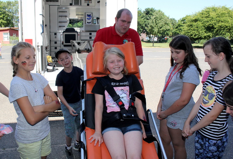 „Und ist es wichtig, den Kindern die Angst vor uns und dem Rettungswagen zu nehmen“, erklärt Daniel Hermanns. Bei der einwöchigen Aktion, die von der Kreissparkasse Euskirchen unterstützt wird und die zum vierten Mal an der Chlodwigschule stattfand, wird natürlich auch Theorie gepaukt.